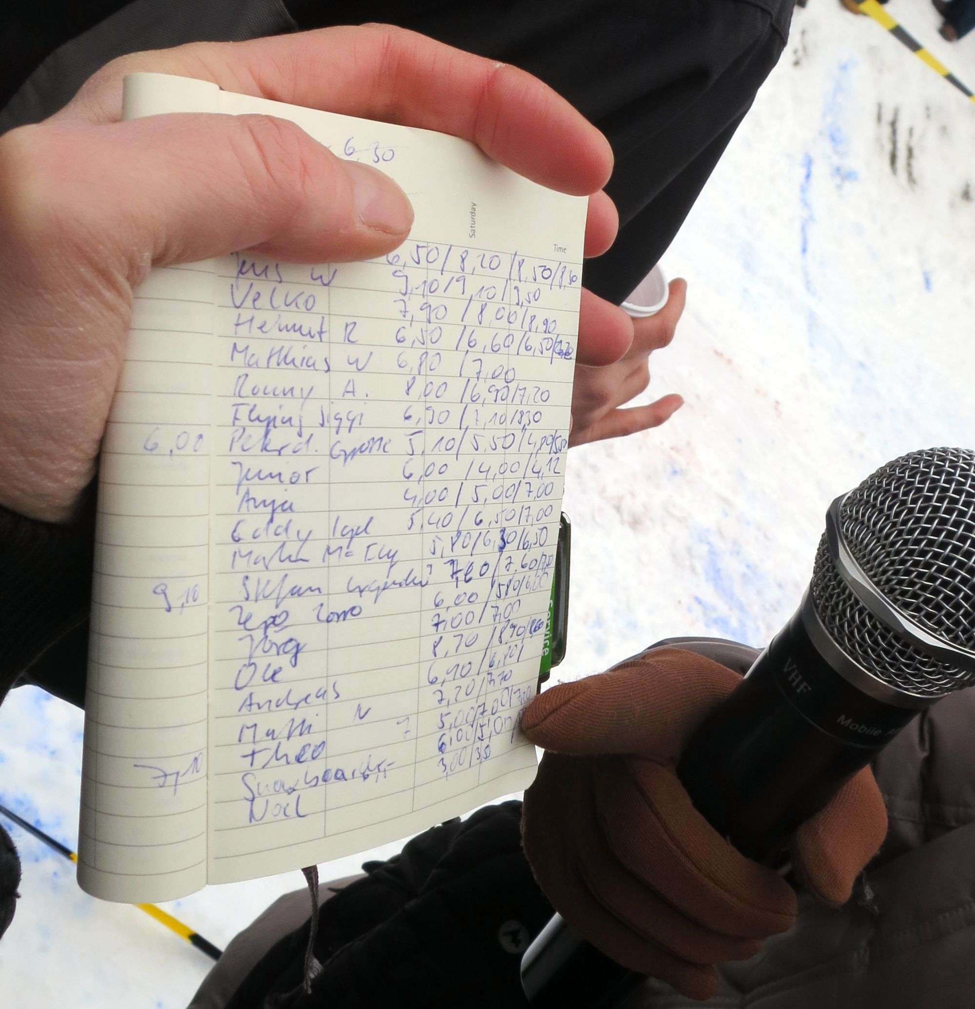 Die Wertungsliste - gemessen wurde Vorderkante Schuhspitze.