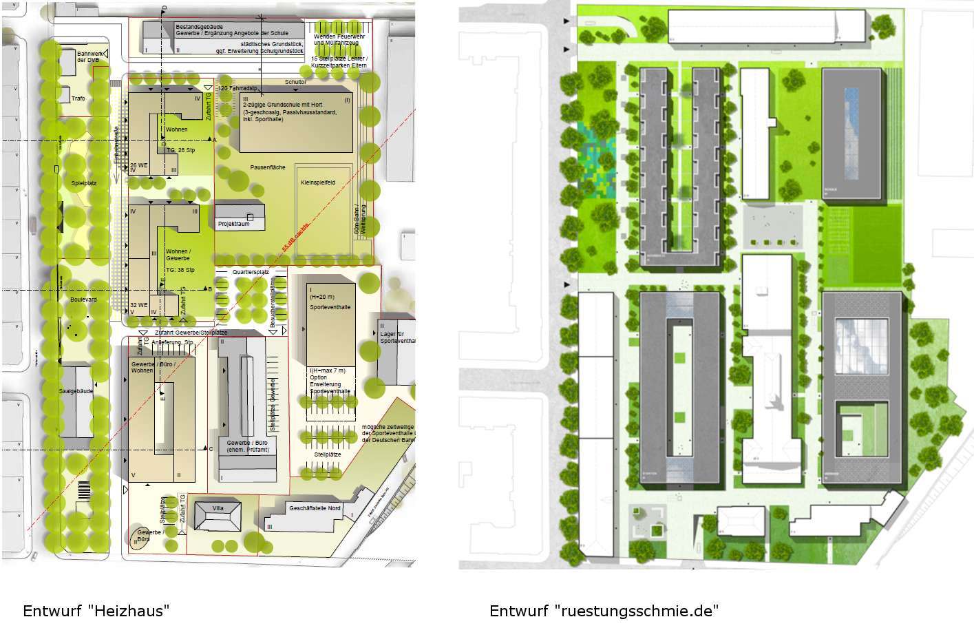 Ich frag mich bei beiden Entwürfen, warum der Spielplatz als so gesetzt angesehen wird – kann da nicht alternativ die Bebauung als Blockrand gemacht werden, um dafür einen ruhigeren Raum im Inneren u.a. für einen Spielplatz zu gewinnen?
