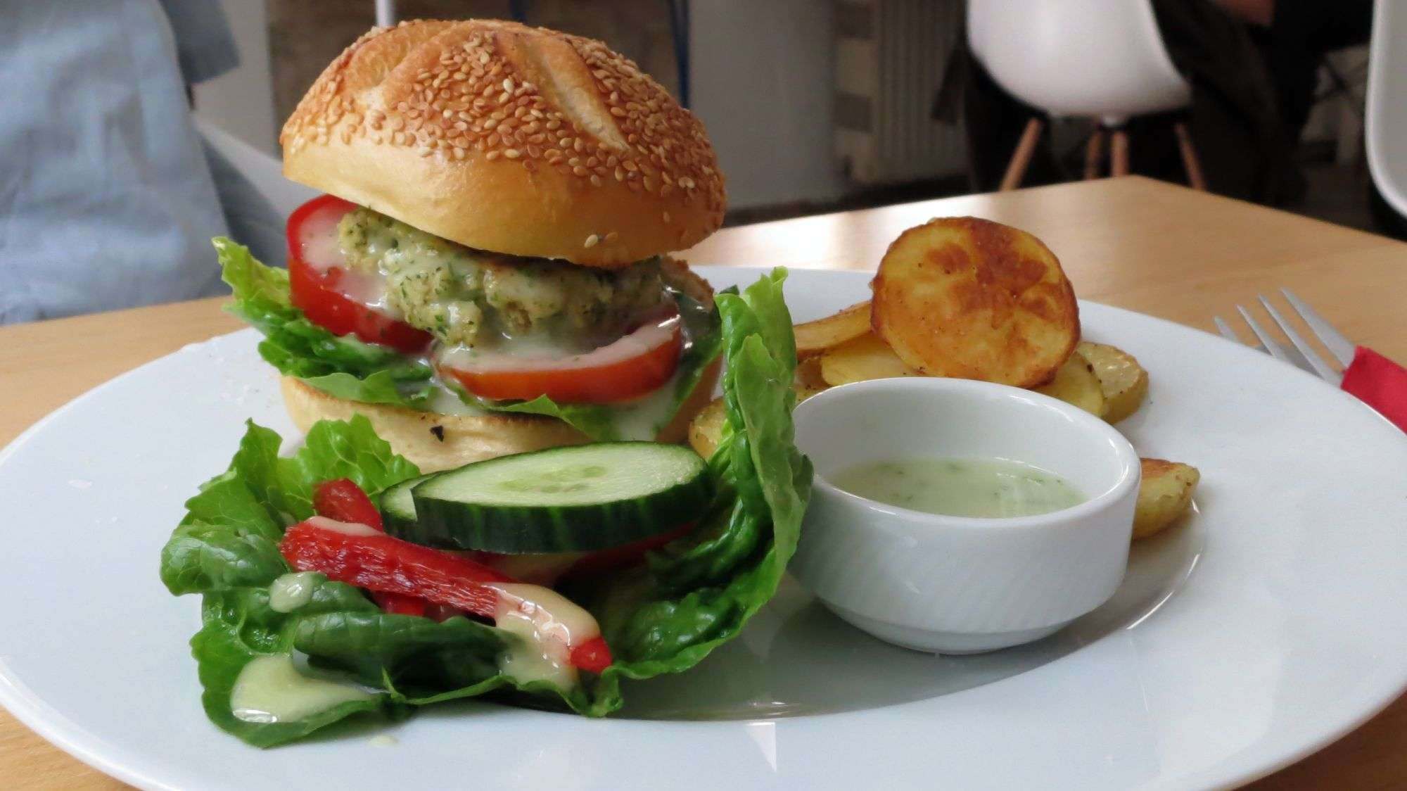 Erster Eindruck: Lecker! Das Burger-Tofu zergeht auf der Zunge, das Brötchen und das Gemüse sind knusprig. Feine Sache, ich bin begeistert, mein Begleiter auch. Das kann ich mir öfter vorstellen. Dank der dazugereichten Bratkartoffeln werde ich auch satt.