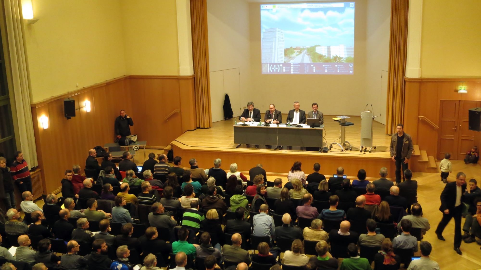 Im Podium saßen Baubürgermeister Jörn Marx (CDU), Wirtschaftsbürgermeister Dirk Hilbert (FDP) als Moderator, der Chef der Dresdner Verkehrsbetriebe (DVB), Reiner Zieschank und Reinhard Koettnitz, der Leiter des städtischen Straßen- und Tiefbauamtes. In einer kurzen Einführung erläuterten Köttnitz und Zieschank die Vorteile der Variante 7, die einen Kompromiss aus Förderfähigkeit, Anwohner-Belangen und den Bedürfnissen aller Verkehrsteilnehmer darstelle. Köttnitz zeigte wieder die Visualisierung, die er schon im Mai vergangen Jahres im Ortsbeirat präsentiert hatte.