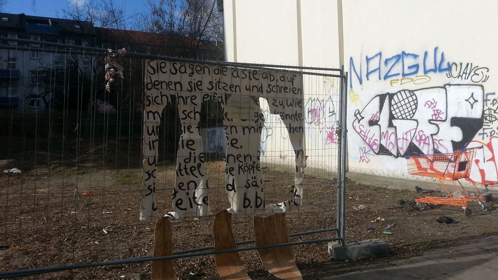 die Baulücke ist jetzt ein Friedhof = mit Trauerbanner-Transparent und aufgestellter Kerze………..