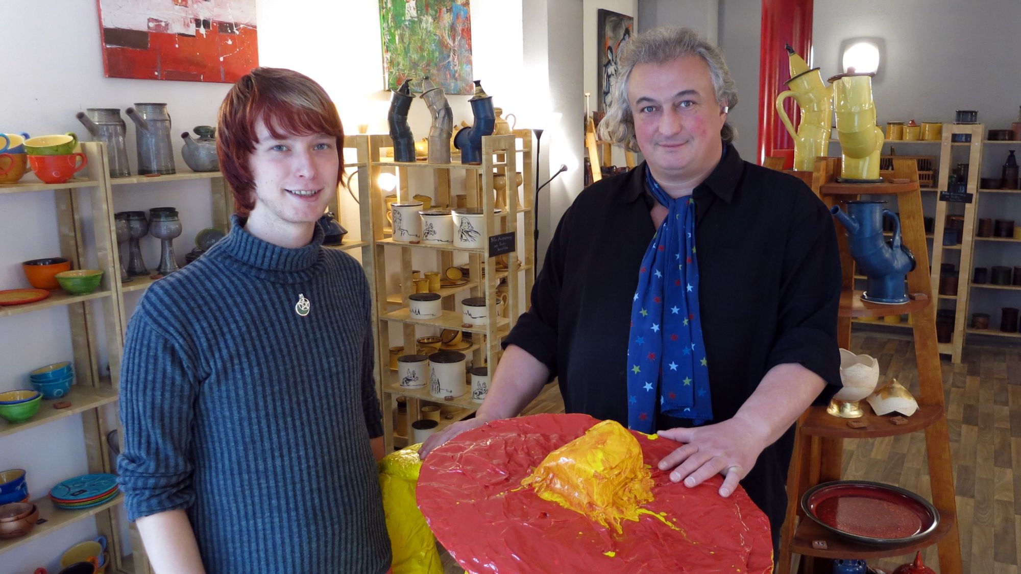 Ricardo, dem das Künstlersein schon mit der Muttermilch eingeimpft wurde, kann auf eine Ausbildung im Einzelhandel zurückblicken, so sind diese Kompetenzen schon mal geklärt. Heute um 15 Uhr wird Eröffnung gefeiert, danach kann man Ingolf und Ricardo aber nur mit Glück antreffen. „Wir geben beide Kurse und sind daher öfter unterwegs, aber wenigstens an zwei Tagen wollen wir jeder mal da sein“, erklärt er.
