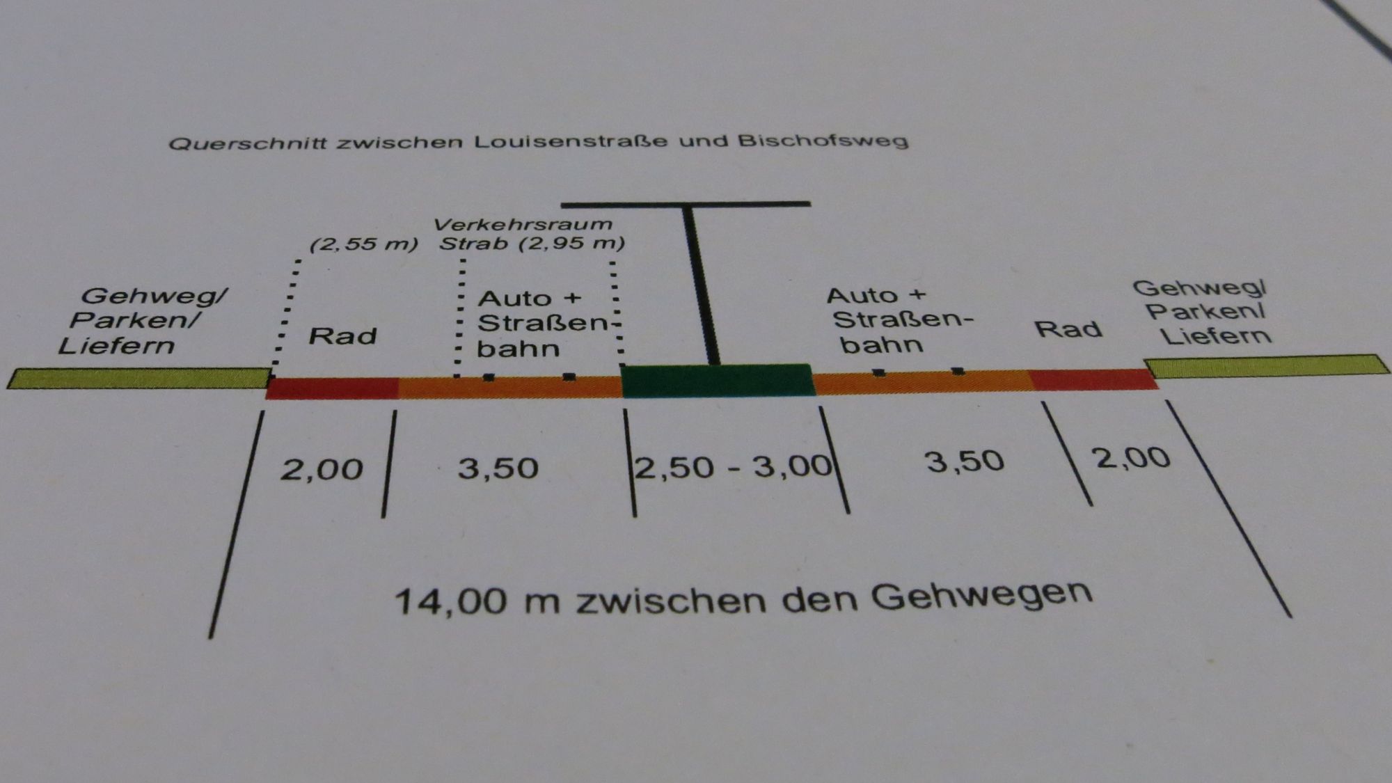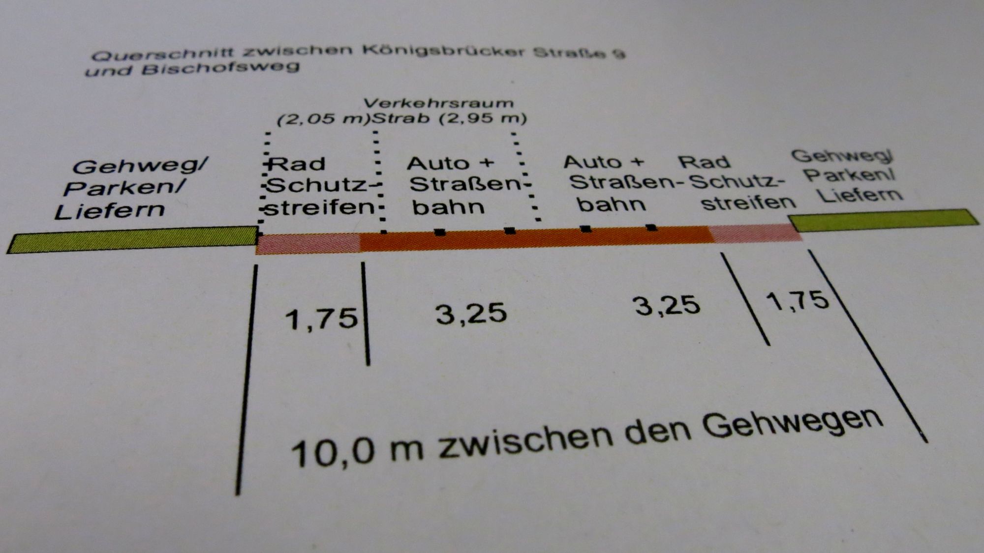 10 Meter breit (wie jetzt). Schmaler Radstreifen, Bahn und Autos auf einer Spur. Vorteil: Die Fußwege bleiben so breit wie sie sind. Es müssen keine Grundstücke erworben werden.