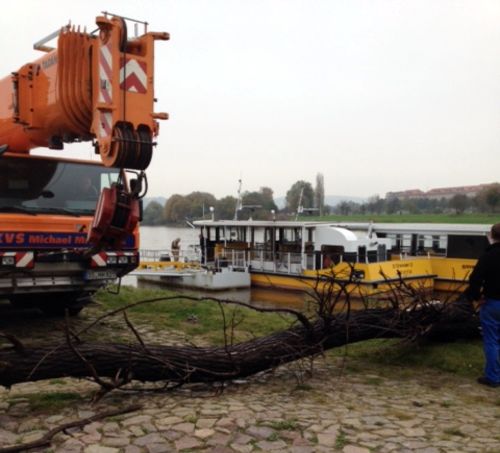 Heute Morgen wurde klar, dass der Baumstamm, der noch rund drei Meter unter dem Schiff hervorragte, nicht einfach entfernt werden kann. Gegen 9 Uhr wurde das Heck der Fähre mit Hilfe eines Kranes angehoben und der Stamm herausgezogen. Anschließend schleppte die „Elbflorenz“ die havarierte Fähre zur Schiffswert nach Laubegast. Dort sollen die Schäden festgestellt und repariert werden. Wann die „Johanna“ wieder überholen kann, ist noch nicht abzusehen. Heute Nachmittag soll ein Ersatzboot an der Fährstelle Johannstadt – Neustadt den Betrieb wieder aufnehmen.