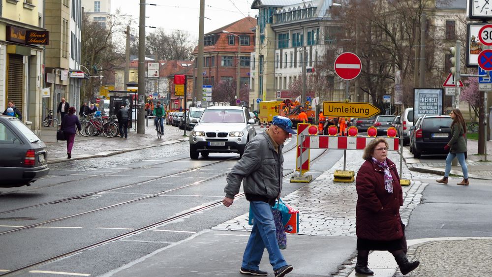 Die Stadt hat für den ersten Baubschnitt eine Umleitung ausgewiesen. Das Stück Königsbrücker Straße kann westlich über Bischofsweg und Dammweg umfahren werden. Die dortige Einbahnstraßenregelung wird für die Zeit der Baustelle aufgehoben. Krötnix: „Das ist zwar eng, aber so viele Autos waren zuletzt auch nicht mehr auf der Königsbrücker Straße unterwegs. Das wird schon passen.“ Die Straßenbahnen der Linien 7 und 8 werden über die Görlitzer und Rothenburger Straße umgeleitet. Netter Nebeneffekt: Die Straßenbahnstreichler an der Kreuzung zur Louisenstraße haben nun viel mehr Material.