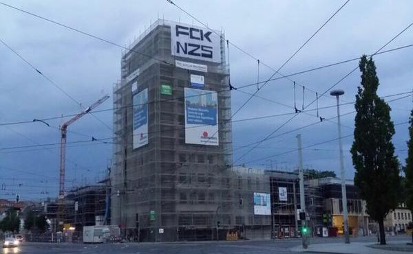 Willkommen in Dresden, da fordern Leute „Fuck Antifa“ Banner, bitter, aber natürlich sind sie nicht rechts -.-. Wer Antifaschist als Schimpfwort benutzt hat meines Erachtens den Schuss nicht gehört und wahrscheinlich auch die Nachwendejahre hier nicht erlebt. Ansonsten gute Aktion und schönes Banner leider war es Nachmittags schon wieder ab.