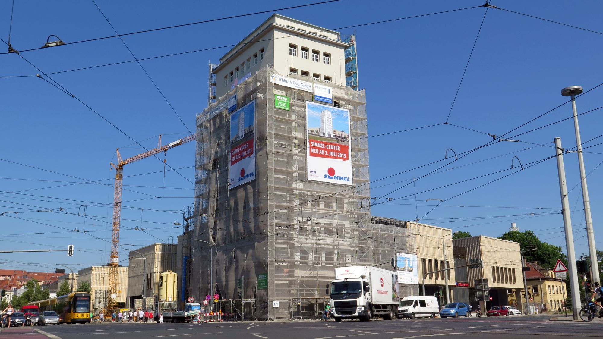Zugleich hat der Investor die obersten drei Etagen des Turms enthüllt, das Creme-Weiß, die denkmalgeschützten Fenster und der nachts leuchtende Schriftzug sind gut zu erkennen. Auch die Tiefgarage ist ab heute geöffnet. Die Einkaufswilligen drängelten sich schon kurz nach 10 Uhr in Scharen durch den Supermarkt, einige hatten sich extra schon vorher angestellt. Extra für den Markt hat Simmel knapp 80 neue Mitarbeiter eingestellt, es werden noch weitere gesucht. Das Einkaufszentrum ist damit fast fertig. Am 31. August wird Medimax auf 860 Quadratmetern einen Elektromarkt im Obergeschoss eröffnen und Anfang September eröffnet im Erdgeschoss des Hochhauses ein Gewürzladen und ein Imbiss.