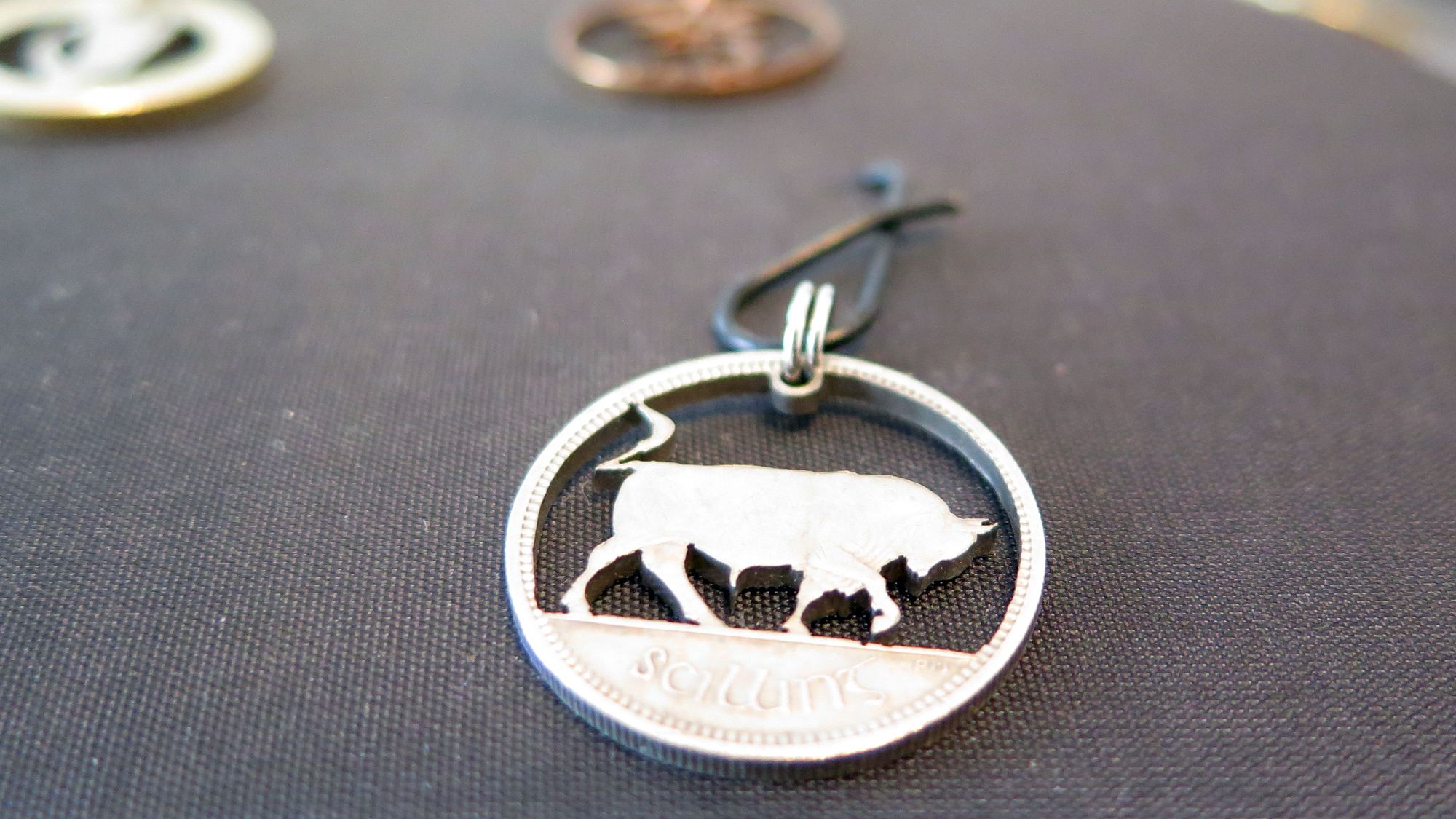 „Doch, doch ich bin ein echter Geldschneider“, erklärt Thomas Jäkel. Dann spannt er eine Münze in den Schraubstock, setzt die Säge an und schneidet sie aus. „Na gut, die richtige Bezeichnung ist Münzsäger“, schmunzelt er. Das Handwerk ist schon fast so alt, wie die Münzen selber. „Etwa 20 Münzsäger gibt es in Deutschland“, berichtet er. Mit einer feinen Säge werden die Münzen ausgehöhlt und verwandeln sich so in kleine Schmuckstücke. Das reicht vom Ohrhänger bis zum Kettenschmuck.