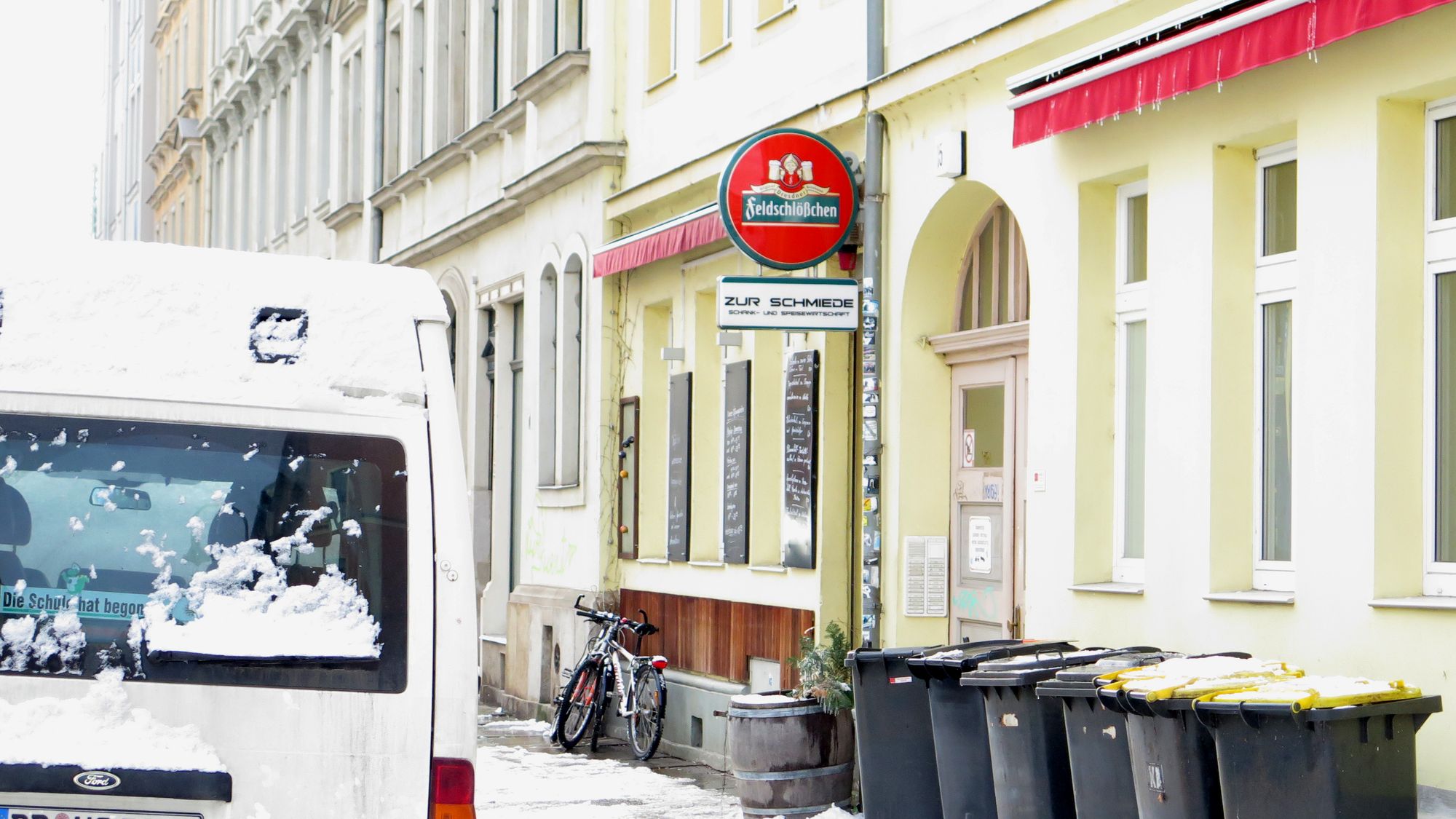 Mit einem Bekannten sitze ich in der Schmiede zum Mittagstisch. Irgendwer hatte mir was von dem Geheimtipp auf der Hechtstraße gesagt. In den Tiefen meines Hinterkopfes schlummerte noch eine üble Erinnerung an die Schmiede. In den frühen 90ern war ich hier mal aus Versehen reingestolpert und von ein paar kräftigen Typen ziemlich schnell wieder hinaus befördert worden. Das scheint Geschichte. Der jetzige Inhaber, mit dem zum Viertel passenden Namen Michael Hecht, ist so ziemlich das Gegenteil eines Rausschmeißers. Freundlich und beflissen nahm er die Bestellung auf, noch ehe sich meine Brille vom Beschlagen erholt hatte. Und schnelle Fragen fordern schnelle Entscheidungen, so wurde es eben das Feuergulasch, das auf der Tageskarte ganz oben stand.