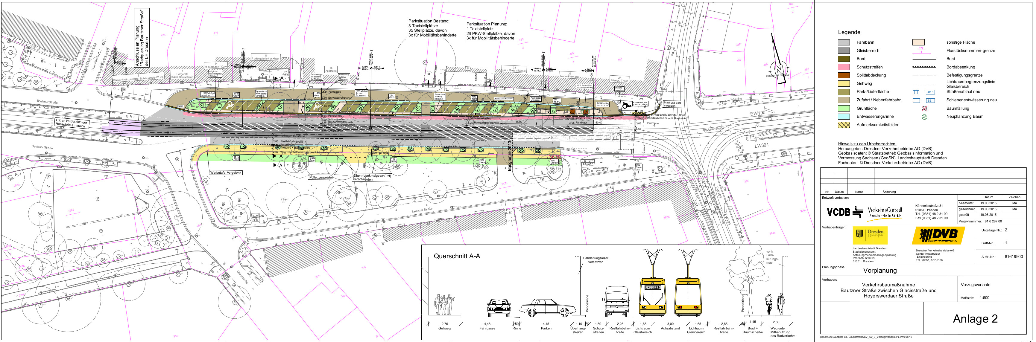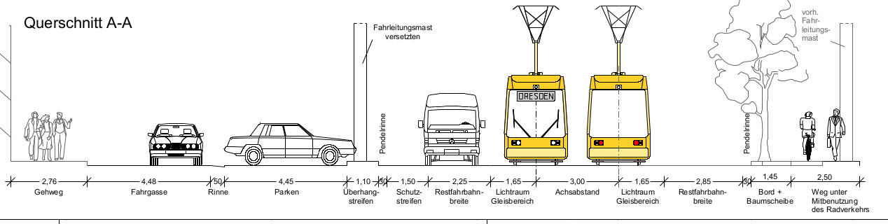 So sieht der geplante Querschnitt aus.Die 220 Meter zwischen Albertplatz und Rothenburger Straße sollen erneuert werden. Im Wesentlichen soll die Fahrspur etwas breiter werden, aber die Bäume auf beiden Seiten erhalten bleiben. Das bedeutet, dass die Fahrbahn nur auf der nördlichen Seite um etwa knapp 2,50 Meter verbreitert werden kann.