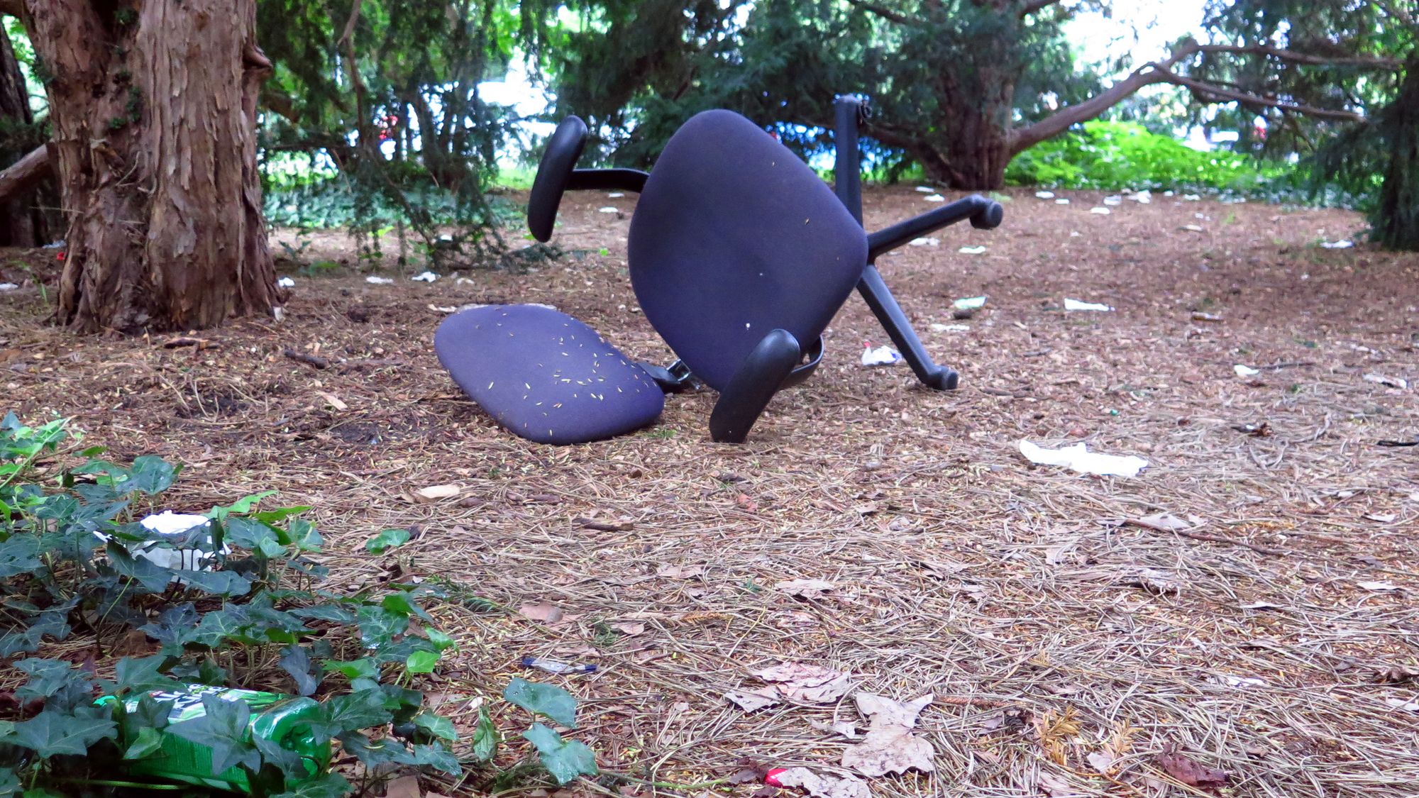 Bürostuhl unter EibenIn einer Aktion haben die Ortsbeiräte zwar kürzlich den Park geputzt. Aber von Dauer ist das nicht. Von der Bautzner aus lässt sich der Park schwer einsehen, um die Eiben herum steht Gebüsch. So sind die Räume unter den Bäumen blickdicht abgeschirmt. Hervorragend geeignet, um mal eben Müll abzuladen und sich für „Geschäfte“ zu treffen, wie ein Anlieger berichtet. Neben den Bänken gibt es keine Papierkörbe, so lassen die wenigen Nutzer die Speise-Utensilien eben liegen.