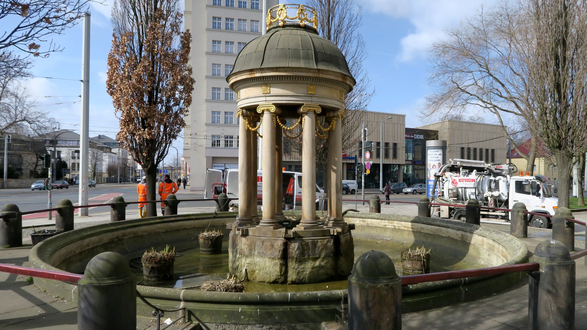 So sollen die Ablagerungen in der Rohrleitung beseitigt werden. Ab morgen soll der Brunnen wieder dann wieder in alter Pracht mit einer Fontäne von etwa 50 bis 70 Zentimeter Höhe sprudeln.