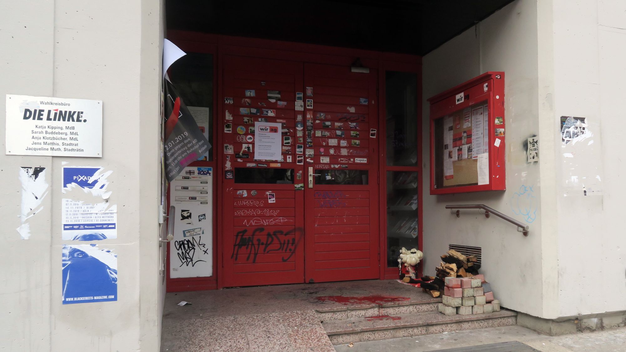 In der WIR-AG ist sowohl die Rosa-Luxemburg-Stiftung beheimatet, als auch die Abgeordneten-Büros von Stadträten und Landtagsabgeordneten der Linken. Auch die Bundesvorsitzende der Linken, Katja Kipping, hat hier ihr Wahlkreisbüro. Die Mitarbeiter des Wahlkreisbüros haben heute Vormittag den Anschlag bemerkt und sofort die Polizei informiert. Die hat die Ermittlungen nun an den Staatsschutz übergeben.