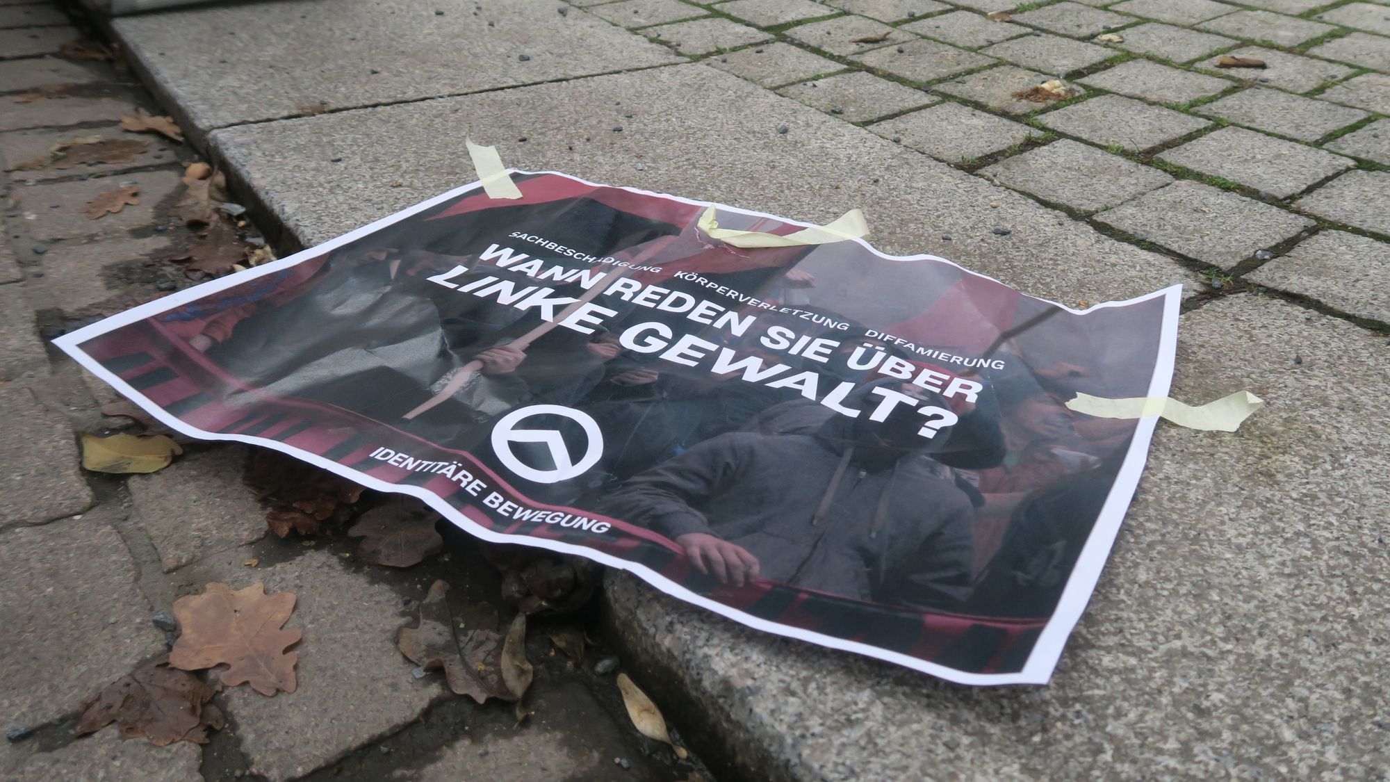 Zu erkennen sind die IB-Vertreter an den gelben Fahnen mit dem griechischen Buchstaben Lambda. Der Buchstabe findet sich auch auf dem Plakat, das vor der WIR-AG noch zu finden war. Die Identitäre Bewegung wird seit August 2016 vom Bundesamt für Verfassungsschutz beobachtet. (Quelle: Bundesamt für Verfassungsschutz)