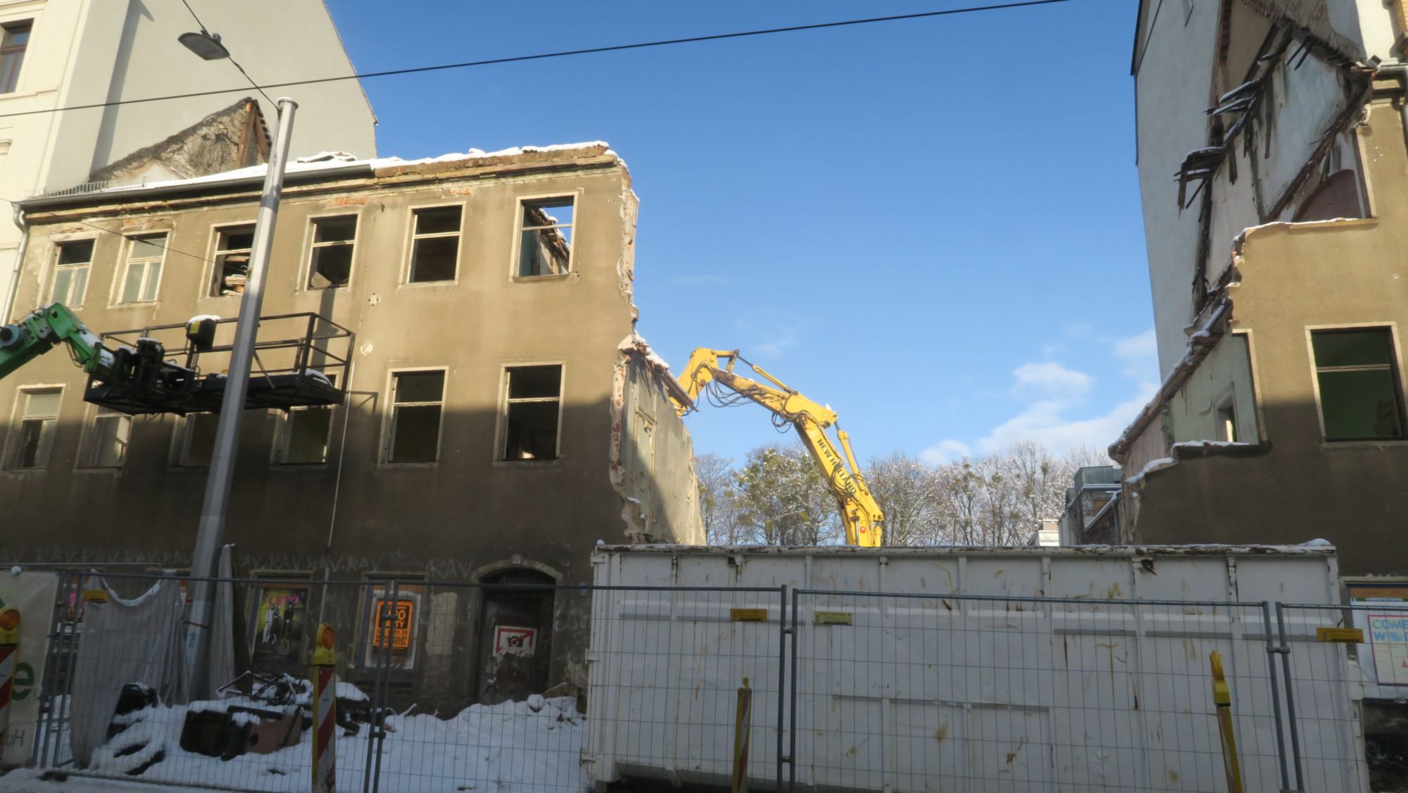 2014 gab es schon einmal Pläne, das Haus abzureißen. 2017 wurde dem Haus das Dach genommen, dann passierte erstmal wieder eine Weile nichts. Das Projekt von 2014 gehört inzwischen auch wieder der Geschichte an. Aktuell findet sich auf den Seiten des Immobilienmaklers Immovista eine Projektbeschreibung und ein paar Skizzen. Die Wohnanlage, die an der Rückseite an den Jüdischen Friedhof grenzt, soll aus drei Gebäuden bestehen. Das Haus an der Bautzner Straße wird eine große Glasfassade bekommen. Tiefgaragen, Fahrradstellplätze, Keller und Wintergärten sind geplant.