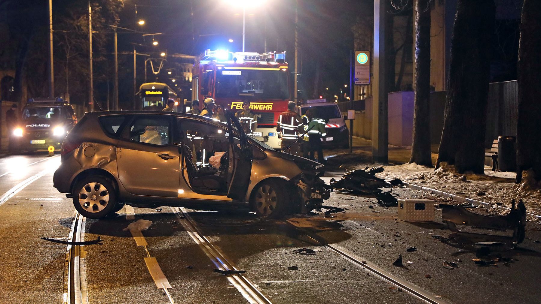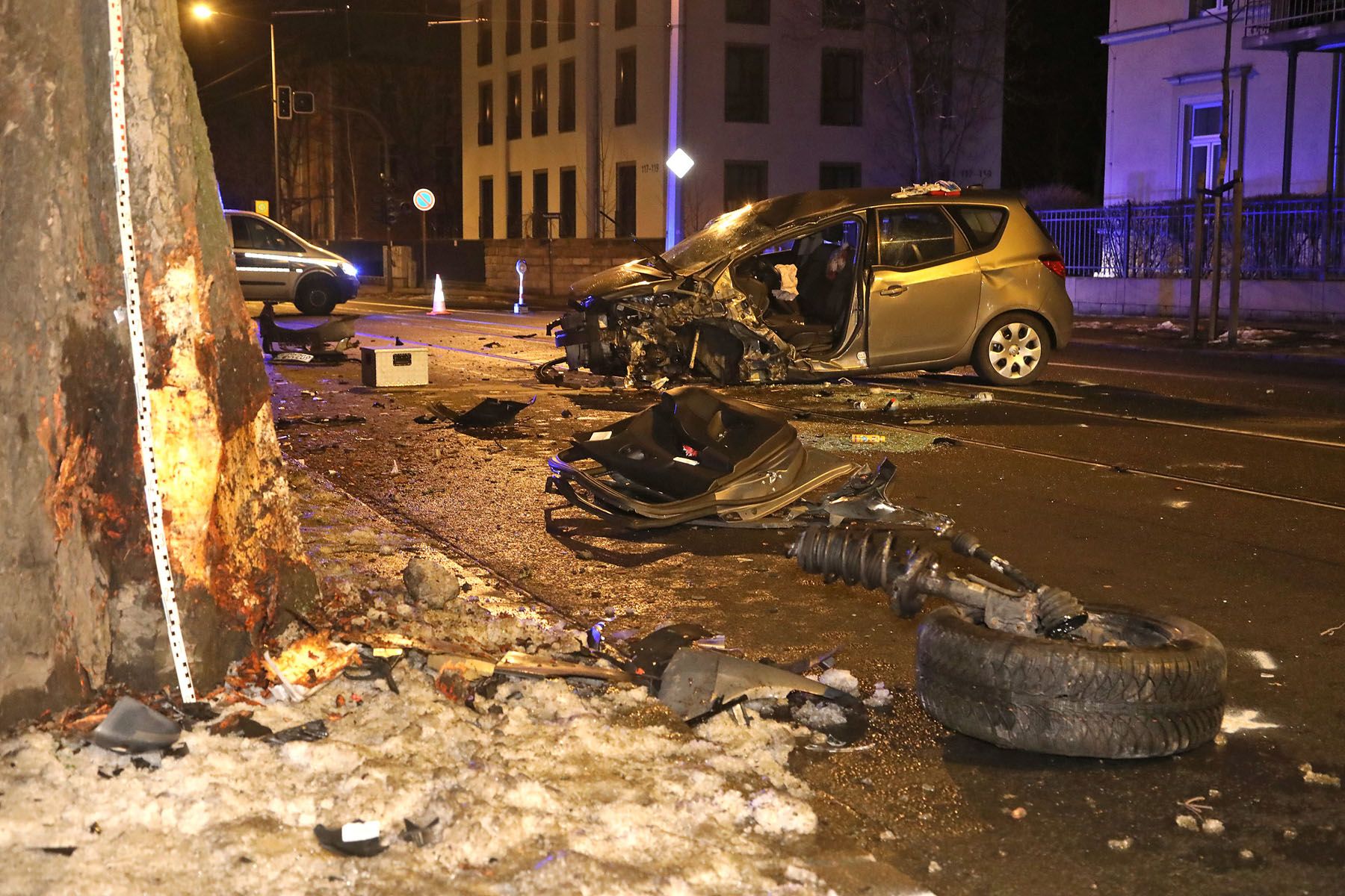 prallte gegen einen Baum. Die Frau wurde im Auto eingeklemmt und musste durch die Berufsfeuerwehr (Wache Albertstadt) befreit werden.