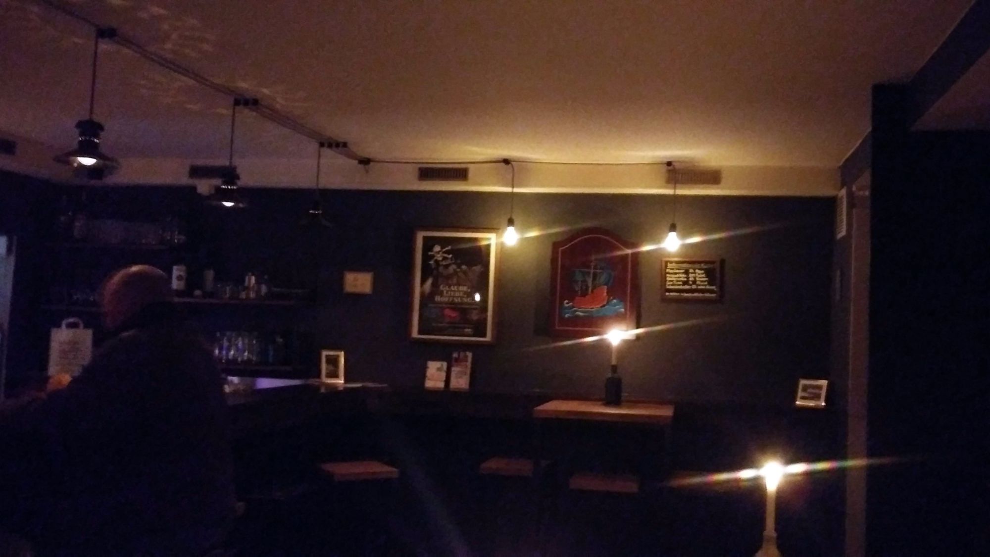 Danke für den Tipp! Feine, kleine Kneipe, die trotz bekannter Adresse nicht so leicht zu finden ist. Keinerlei Außendarstellung, Werbeträger, Leuchtreklamen etc…man muss sich also Mühe geben. Prima! Auch im Inneren der Versuch von Neutralität, keine Werbung, keine Brands auf Glas, Ascher, Serviette. Ausgewählte Musik, die sicherlich nicht Jerdermanns Sache ist aber wohl auch nicht zufällig dudelt, denn meist kommt sie vom Plattenteller.