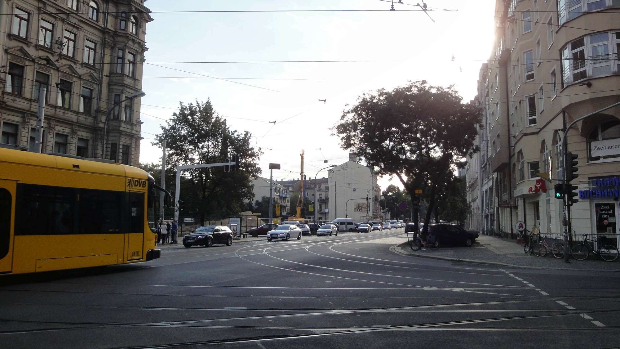 -> Die Haltestelleninsel brauchts eigentlich nicht: von der 6 in die 13 kann ich am Rosa-Luxemburg-Platz, von der 11 in die 6 am Albertplatz. Die anderen Umsteigebeziehungen funktionieren dann auch genauso gut oder schlecht wie jetzt: zur Insel muss man ja auch erstmal kommen…