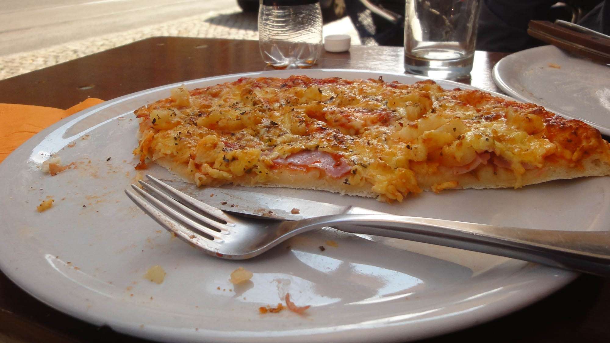 Nach einer kleinen Weile brüllt der freundliche Pizza-Bäcker „einmal Hawaii“, ich hatten es mir draußen gerade gemütlich gemacht, freute mich über die auf dem Fußweg vorbeiradelnden Studentinnen und genoss den Sonnenschein.