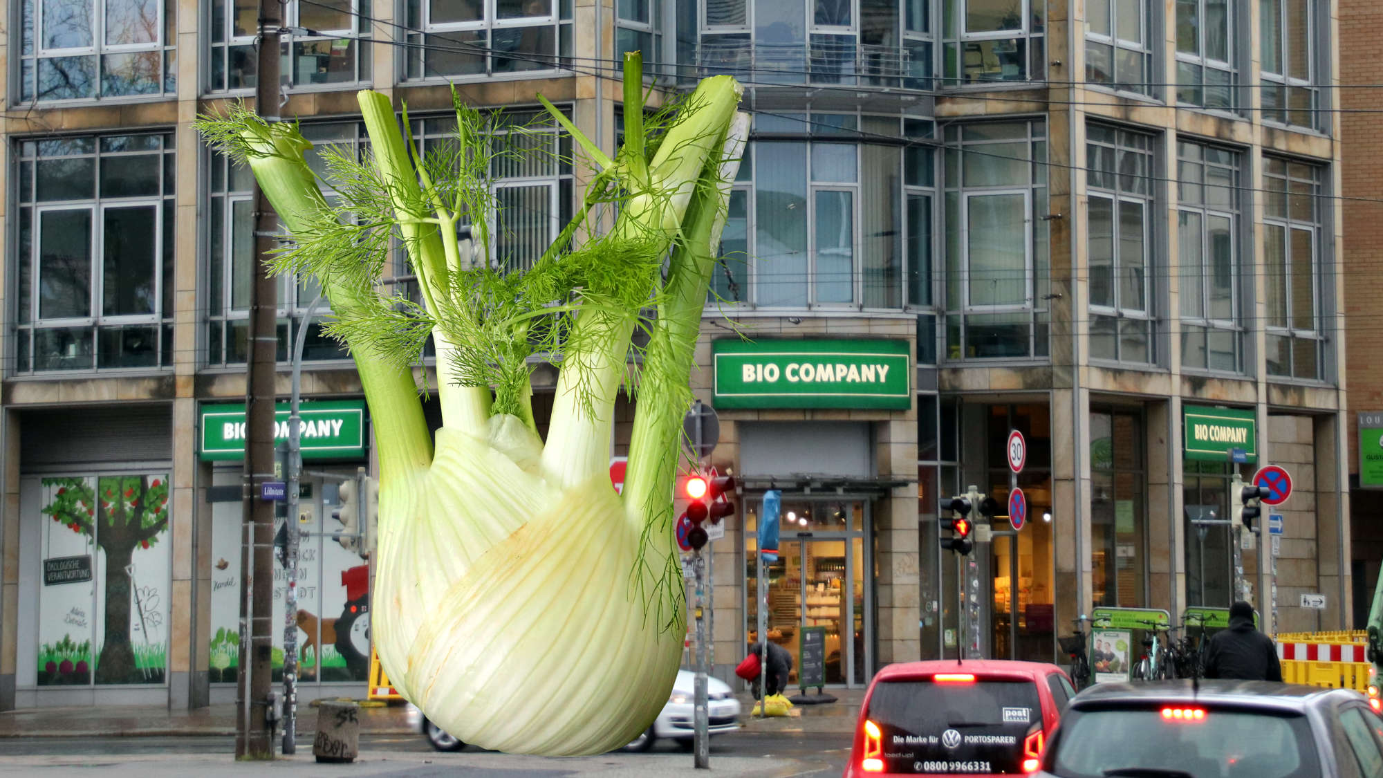 Vor ihm fährt eine junge Frau mit dem Fahrrad. Plötzlich hoppst ein Fenchel aus dem Fahrradkorb und rollt auf dem Bürgersteig entlang. Guido würgt seinen Kollegen am Telefon ab, greift den Fenchel und rennt hinter ihr her. Richtung Schauburg.