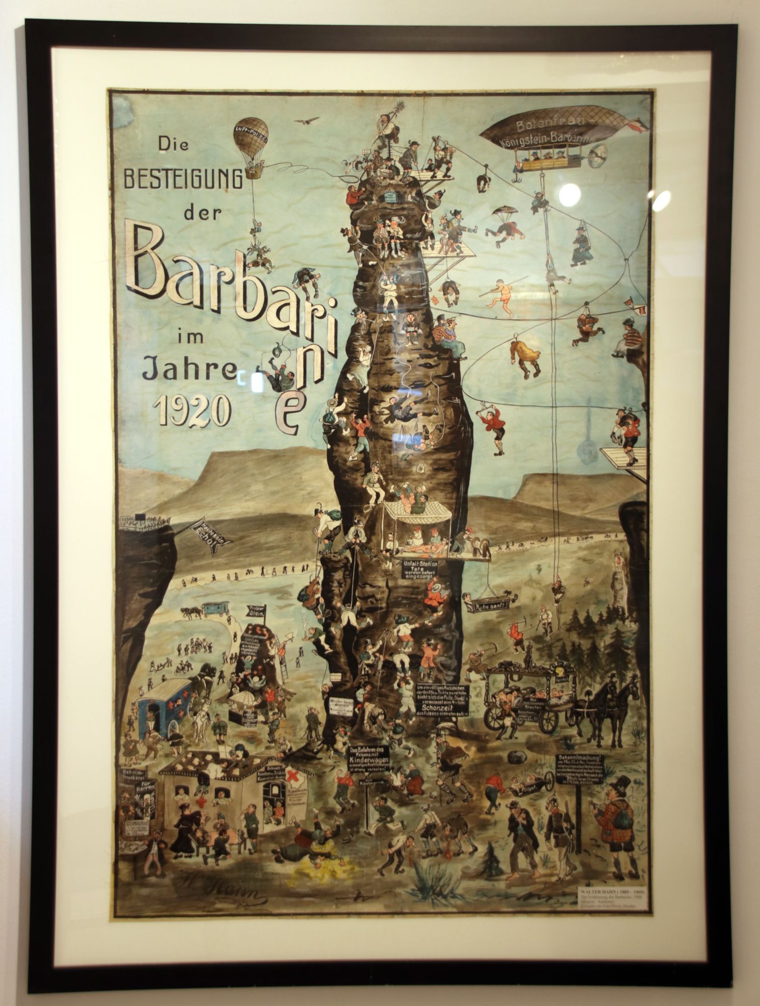 Auf zwei Etagen gibt es geballte Heimat, kontrastreich angeordnet. So hängt ein runzliger Carl Spitzweg aus dem 19. Jahrhundert neben einem Titus Schade von 2010. Gleich neben der Kuckucksuhr zeigt ein großes Ölgemälde, wie in den 1930er Jahren Neubauten entstanden. Nebenan zeigt ein Wimmelbild von Walter Hahn „Die Besteigung der Barbarine“. Dieses beeindruckende Bild vom einst schönsten Kletterfelsen der Sächsischen Schweiz aus dem Jahre 1908 war offenbar seiner Zeit weit voraus. Wie auch Walter Hahn, dessen Luftbildfotografie ein beeindruckendes Bild von Dresden und Umgebung zeichnet.