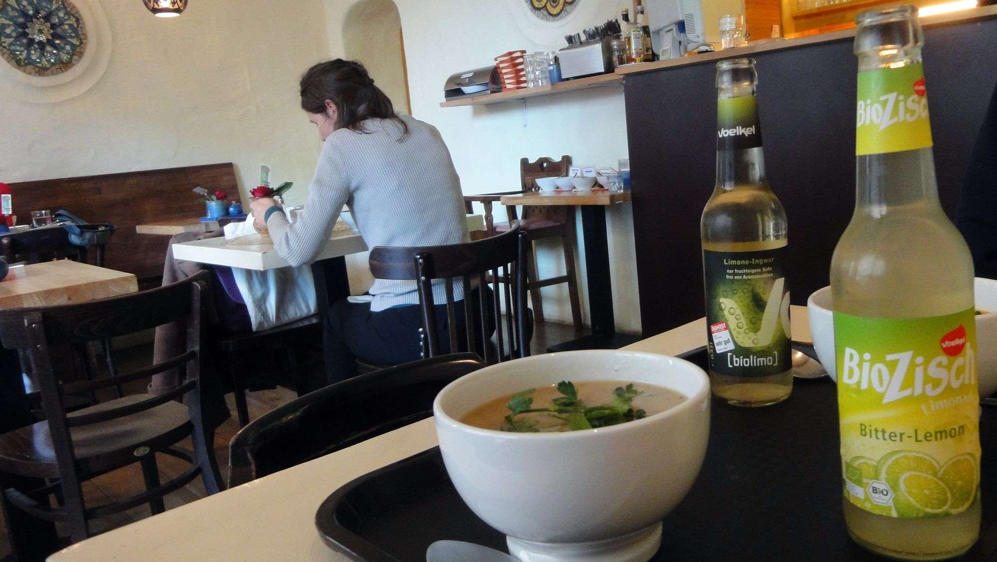 Dieser hatte den Laden im Februar wiedereröffnet, weil er ihn in den vergangenen Jahren so lieb gewonnen hatte. Der erste Eindruck: Hier ist alles irgendwie esotherisch, die Farben, der Buddha, die Gäste. Nicht ganz dazu passen wollen die Beschriftungszettel, zum Beispiel über dem Brotkasten. Aber als Orientierungshilfe sind sie akzeptabel. Auch die sehr akkurat gestapelten Servietten daneben fallen etwas aus dem Rahmen. Ich bestelle eine Kartoffelsuppe, das war das einzige Gericht an der Tafel, bei dem mir der Name was sagte. Dazu gibt es eine Bio-Limo.