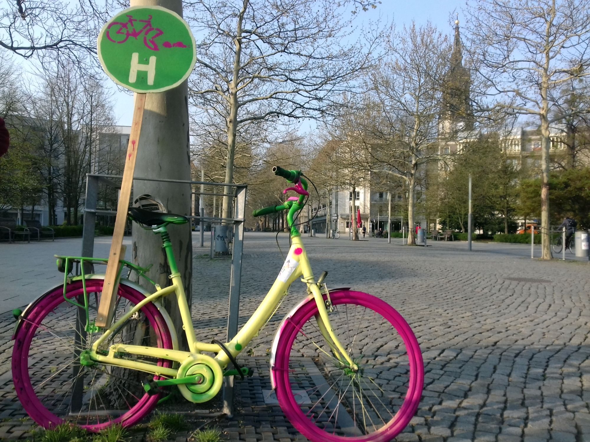 Menschen, die auf dem Weg zur Arbeit, zur Schule, zum Frühstücken sind. „Ein ganz gewöhnlicher Montagmorgen“, könnte sich das Fahrrad denken. Dass sich dann aber 8.40 Uhr mehr und mehr Radfahrer*innen an genau diesem bunten Fahrrad sammeln, könnte das Fahrrad stutzen lassen.
