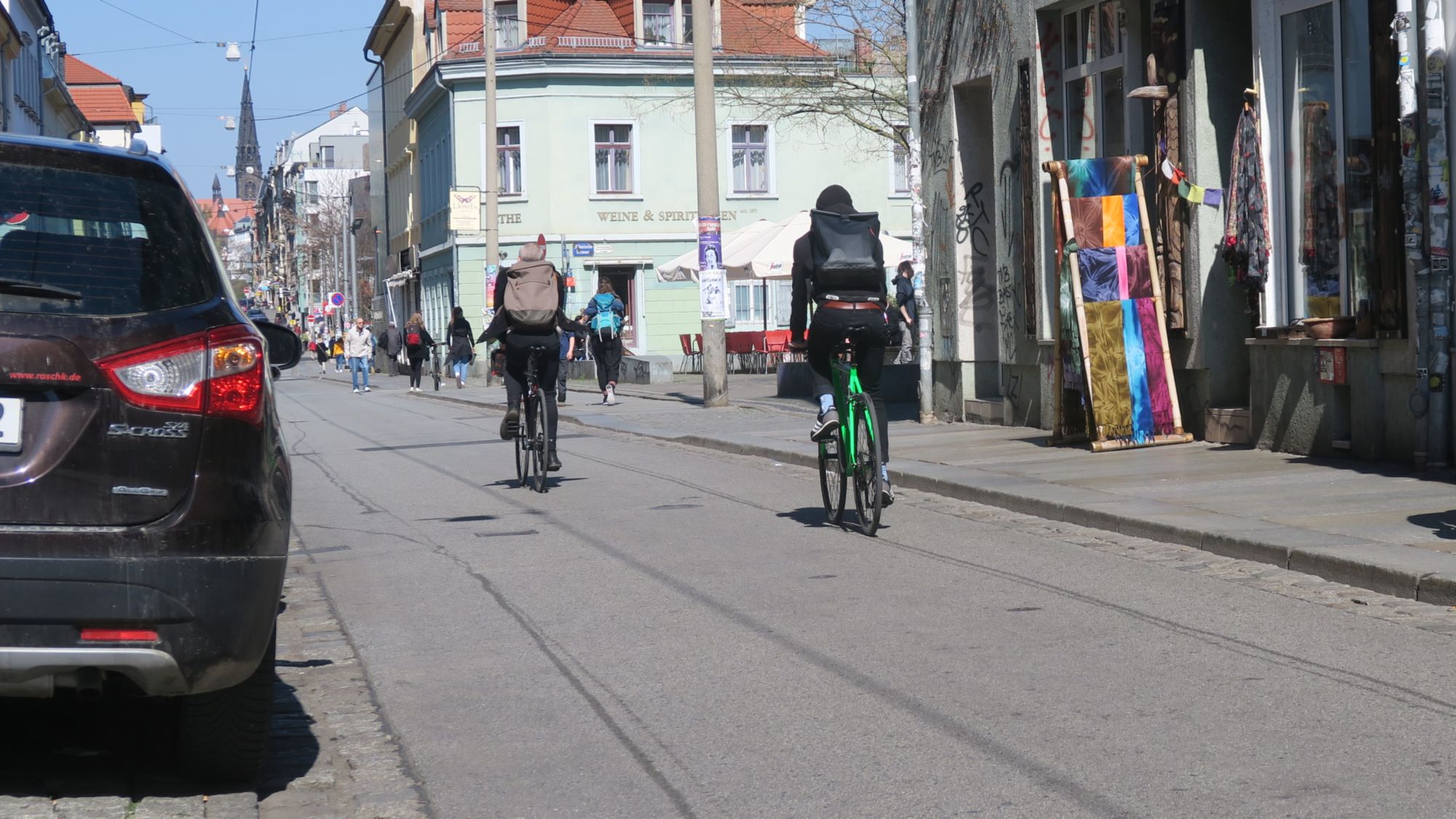 Bei 1,5m Überholabstand kann auf der Alaunstraße kein Auto regelkonform überholen. Daher: Radfahrer, fahrt in der Mitte, damit Porsches & Co. gar nicht erst auf die Idee kommen…
