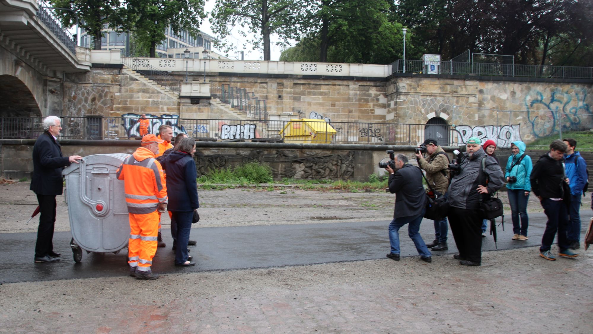 In Anwesenheit der Umweltbürgermeisterin, des Stadtbezirksamtsleiters und des Chefs der Dresdner Stadtreinigung (SRD) wurden heute drei Roll-Container am Elbufer aufgestellt.