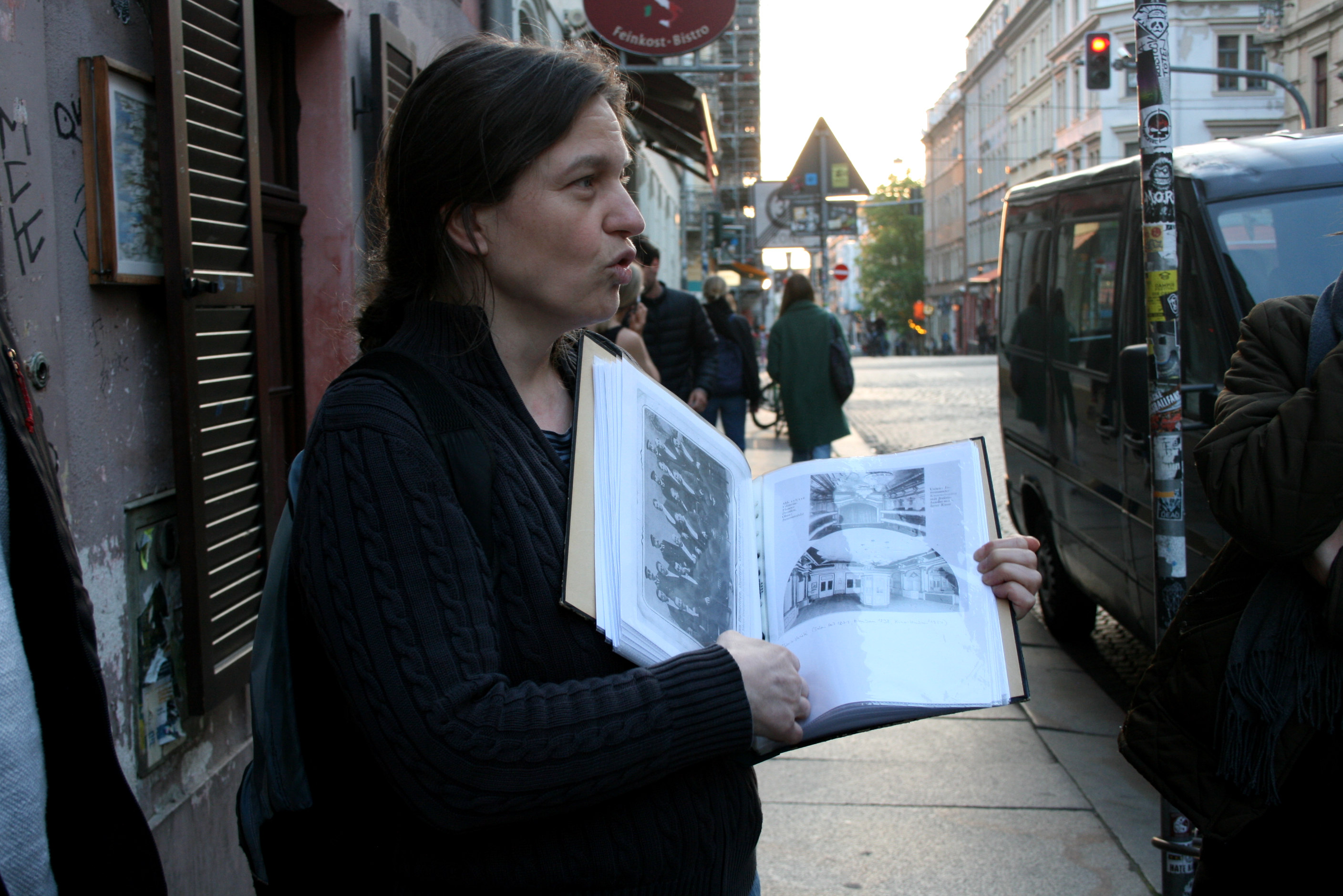In der Louisenstraße 55 kommt die zehnköpfige Gruppe wieder zum Stehen. „Na, wer kennt das Porträt da oben?“, fragt Daniela Berndt. Niemand weiß es. Die Veranstalterin Uta Gensichen erklärt später: „Wäre ich an dem Ort jetzt mit dem Fahrrad oder dem Auto lang gefahren, hätte ich das Porträt nie gesehen. Das ist das Schöne am Zufußgehen, man kann fast überall verweilen und genauer hinschauen.“
