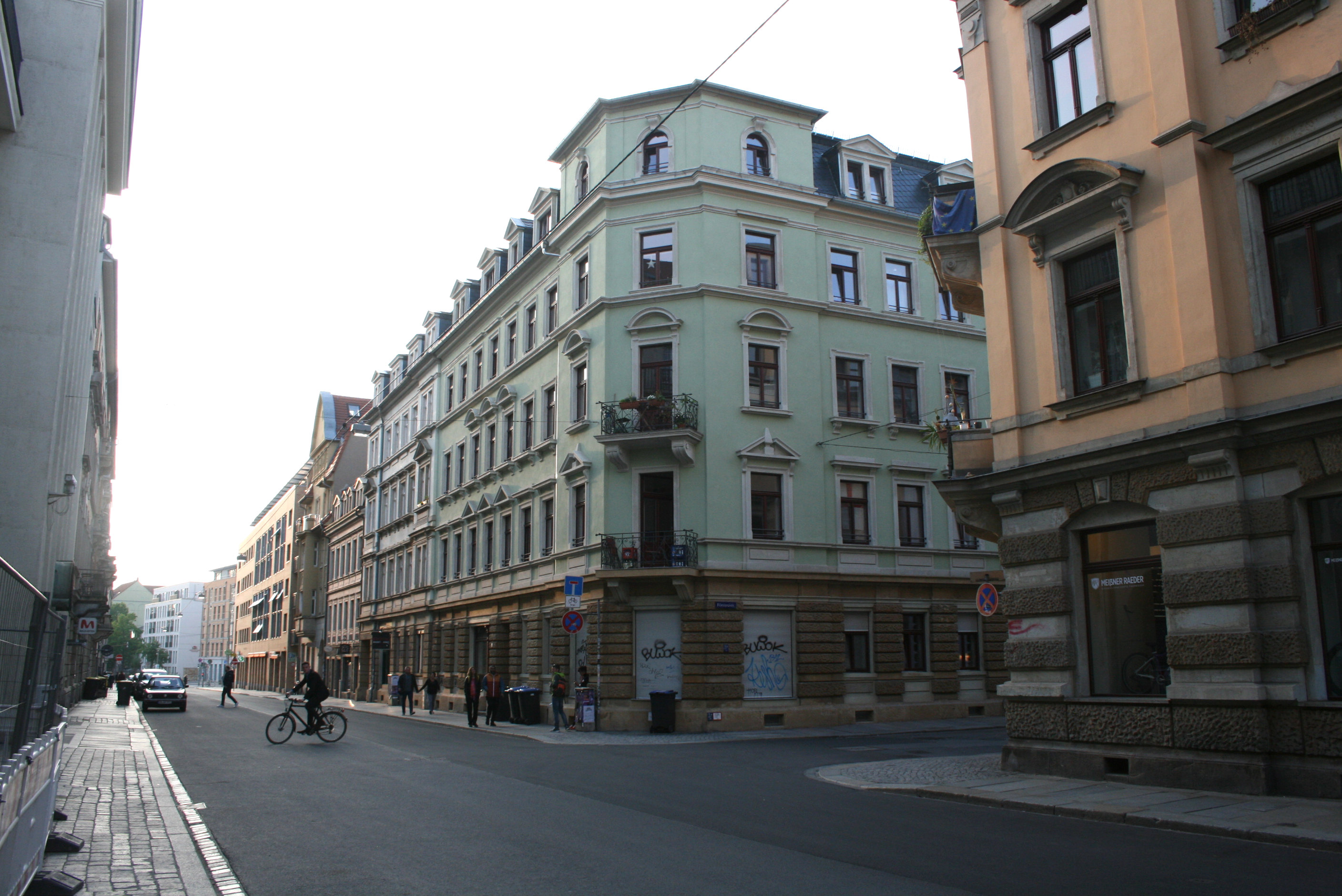 An der Grünfläche Ecke Alaun-/Böhmische Straße machen die Beiden einen längeren Halt. „Hier war mal das Palasttheater – also eigentlich ein Kino“, erklärt Daniela Berndt. Später wurde das Kino in Kosmos umbenannt, wegen eines Besitzwechsels 1934. Der Grund: Die vorherigen Betreiber*innen waren jüdisch. Heinz-Olaf Müller packt dabei ein kleines Büchlein aus und beginnt zu schwärmen. Was er in der Hand hält, ist das Buch: „Das Lied ist aus“ von Henny Brenner, die Tochter des ehemaligen Palasttheater-Betreibers. Sie schildert darin die Zeit vor 1934 aus Sicht ihrer Kinderaugen.