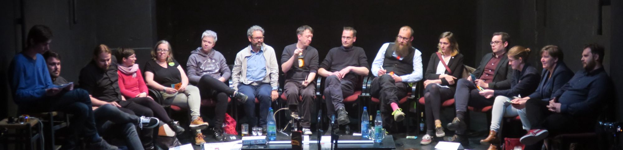 Die Piraten hatten zum politischen Schlagabtausch ins Projekttheater geladen. Das Theater war bis auf die Treppe gut gefüllt. Die Kandidat*innen hatten je Antwort immer 60 Sekunden Zeit und einige Joker, wie Widerspruch und Verlängerung. Mittels Buzzer und einer bunten Leuchtleiste navigierte der Moderator einem Quiz-Master gleich durch den Abend.