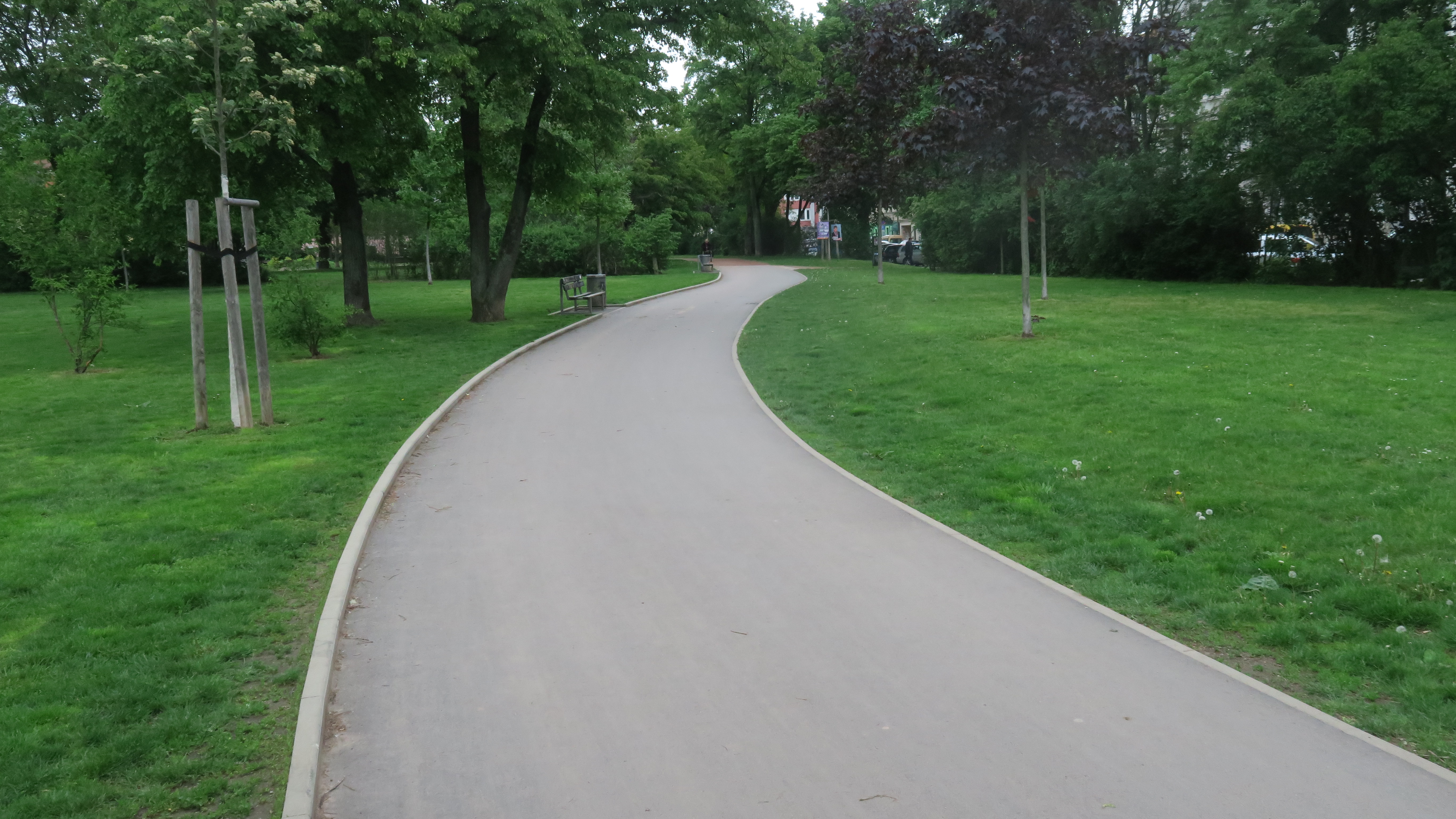 Der Weg bei den Tischtennis-Platten wird mit einer Asphalt-Schicht versehen, ähnlich wie der parallel zum Bischofsweg. Die Strecke zwischen Markt und Kletterspinne ist als Kiesweg geplant.