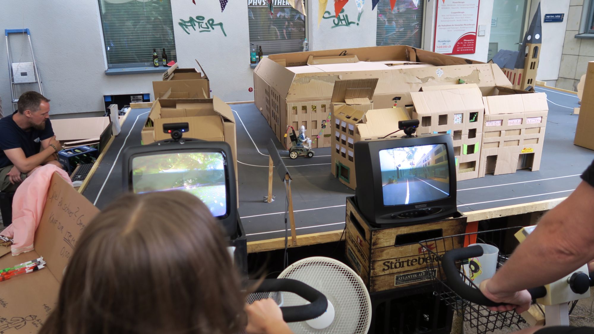 Nebendran kurz die Beine aufschütteln und das ultimative Rennen verfolgen. Am Hometrainer wird gestrampelt und Omma und Oppa rasen durch die Pappe – nun Opa hat ein bisschen die Richtung verloren, was solls ist ja BRN.