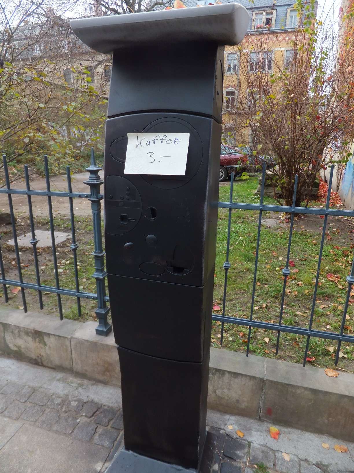 das Ding ist kaputt. Anderen ihr Zeug kaputtzumachen ist einfach nur dumm. Es erzeugt Frust bei denen die es reparieren müssen und kostet sinnlos Geld. Wenn der Typ wenigstens so gearbeitet hätte, dass das Gerät weiterhin funktioniert (oder wirklich Kaffee auspuckt)! Falls das ein Protest gegen den Autoüberschuss in der Neustadt sein soll, dann ist das noch dümmer, denn keiner wird solchen Idioten Platz für ihr Auto machen wollen.