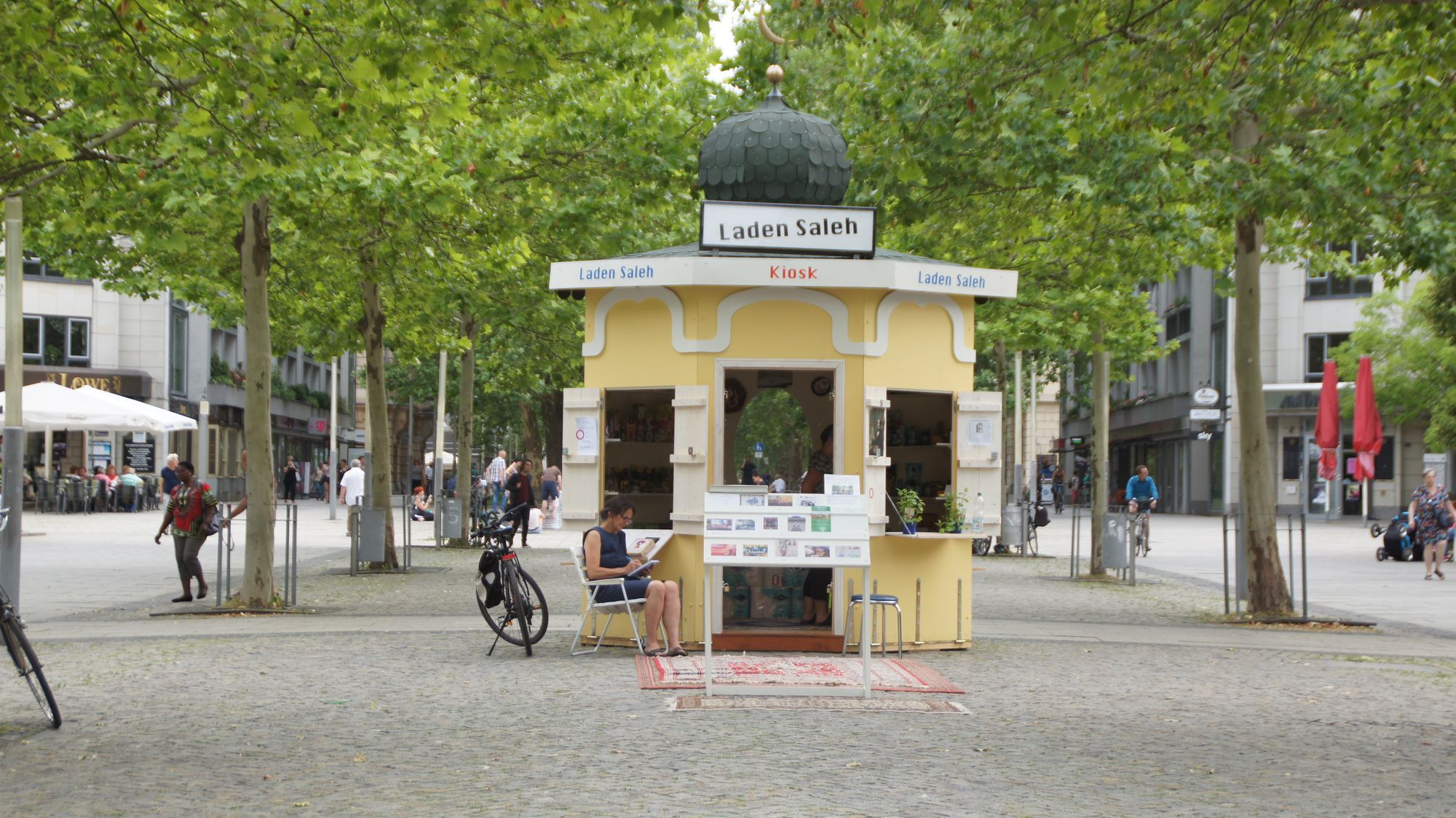 „Es ist toll, wie die Menschen sich damit auseinandersetzen“, sagt Uta Steuer und behält die Laufkundschaft im Blick. Viele seien aufgeschlossen, manche grummelten eine Kritik in sich hinein oder werfen grimmige Blicke. Bisher, erzählt sie, habe es jedoch noch keine direkten Anfeindungen gegeben. Wie eine Requisite aus 1001 Nacht schmückt der kleine Kiosk das Entrée zur Hauptstraße. Davor liegen bunte Orientteppiche.
