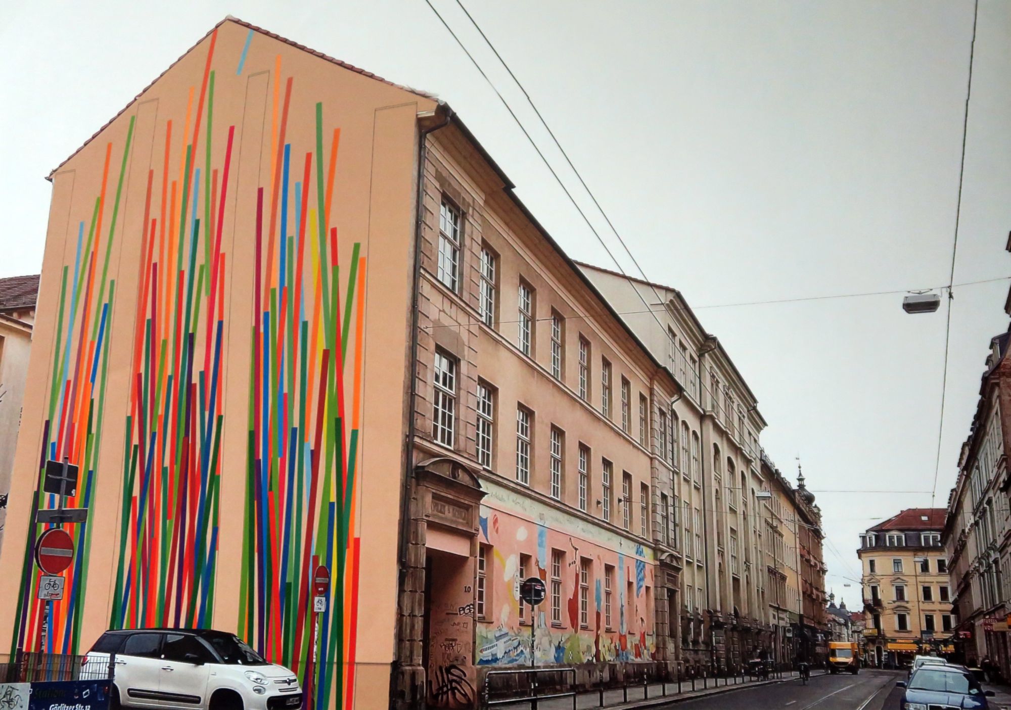 Die Wand an der 15. Grundschule an der Görlitzer/Ecke Seifhennersdorfer Straße war 1992/93 erstmalig gestaltet worden. Die Arbeit des Künstlers Dieter Bock von Lennep trug den Titel „Eine Wand bricht auf“.