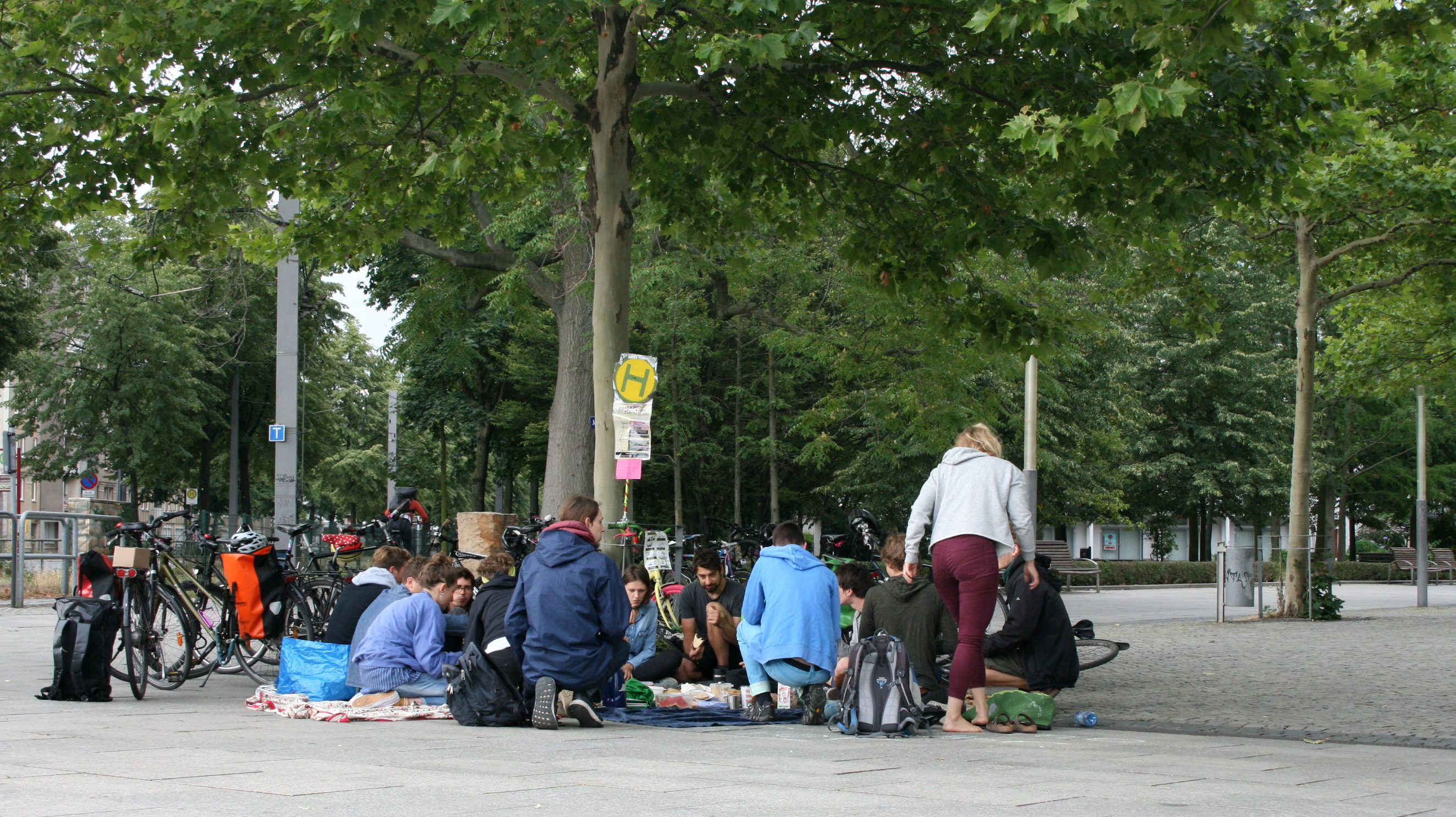 Doch diesen Donnerstag ist das bunte Fahrrad überrascht. Schon Punkt 8 Uhr kommen die ersten Radfahrer*innen und halten vor ihm an. Sie packen Decken und Kuchen aus, stellen Kaffeekannen bereit, holen Brötchentüten hervor. Der Platz vor dem bunten Fahrrad füllt sich – bald schon sitzen an die 20 junge Menschen vor ihm und picknicken. Ein morgendliches Frühstück am Jorge-Gomondai-Platz. Sie wollen die letzte Critical Mass in diesem Semester feiern und sich bei all jenen bedanken, die mitgefahren sind.