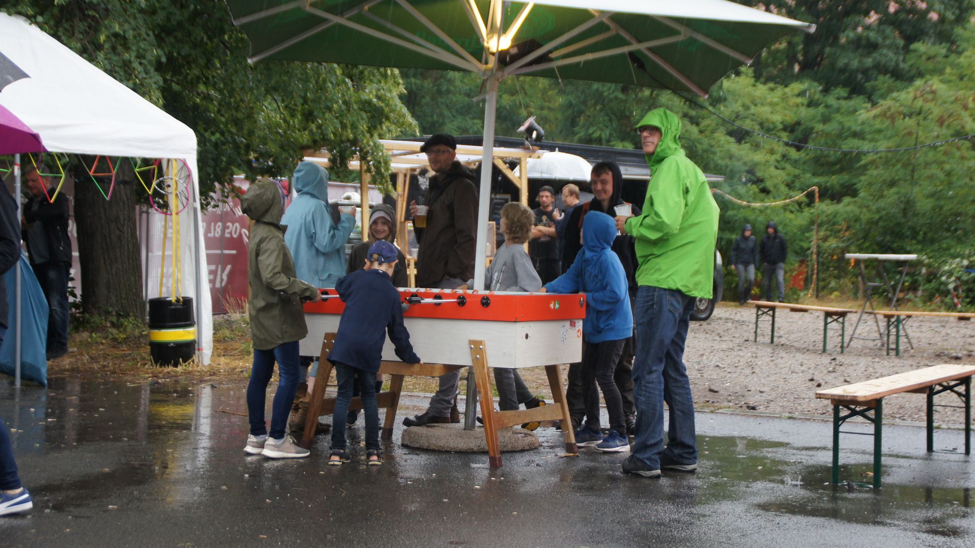 Tapfer greifen Seattle Jay in die Saiten. Ab und an schallt Jubel über den Platz – er zeugt von einem weiteren erfolgreichen Schuss am Kickertisch. Hier vertreibt man sich kurbelnd die Regenzeit. Im Kaffeekränzchenzelt gibt es Kuchen und Tee. Von hier aus hat man einen wundervollen Blick auf die Wasserlöcher. Rundum folierte Regenzwerge fallen vor- und rückwärts in mattgrau schwappende Pfützengräben und krähen vor Wonne. „Du kannst schreiben, dass der Burrito lecker schmeckt“, mampft meine zauberhafte Begleiterin. Der kommt von Mia’s auf der Conradstraße, die neben The Boy and the Burger für volle Backen sorgt.