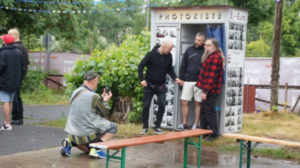Wir laufen im strömenden Regen auf ein Gitarrenriff. Der feste Boden unter den Füßen ist aus Beton. Unter Schirmen und Zelten drängen sich die Samstagnachmittagsbesucher des umsonst&draußen-Festivals, das gerade für einige Stunden ins Wasser fällt. Die Schilder versprechen es: Der Abend ist noch bier- und mixbar.