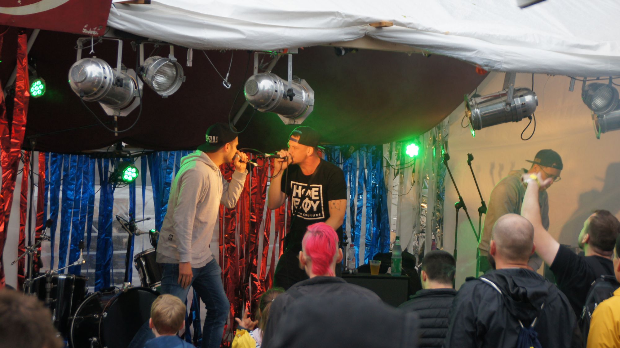 Die Biertischgarnituren auf dem Beton sind mittlerweile trocken gesessen, die Regenschirme zugeklappt und die Schlangen an den Tresen angewachsen. Das chemische Inhalat der Dixi-Klos spült man am besten mit Fassbrause in den Geschmacksrichtungen Weiß oder Rot hinunter. Auf dem vorderen Floor sind die nickenden Köpfe in der ersten Reihe bei Hiphop mit Genieration diesselben geblieben, haben aber mehr Rückenhalt. Den Aggregatzustand kann man nunmehr als feuchtfröhlich bezeichnen.