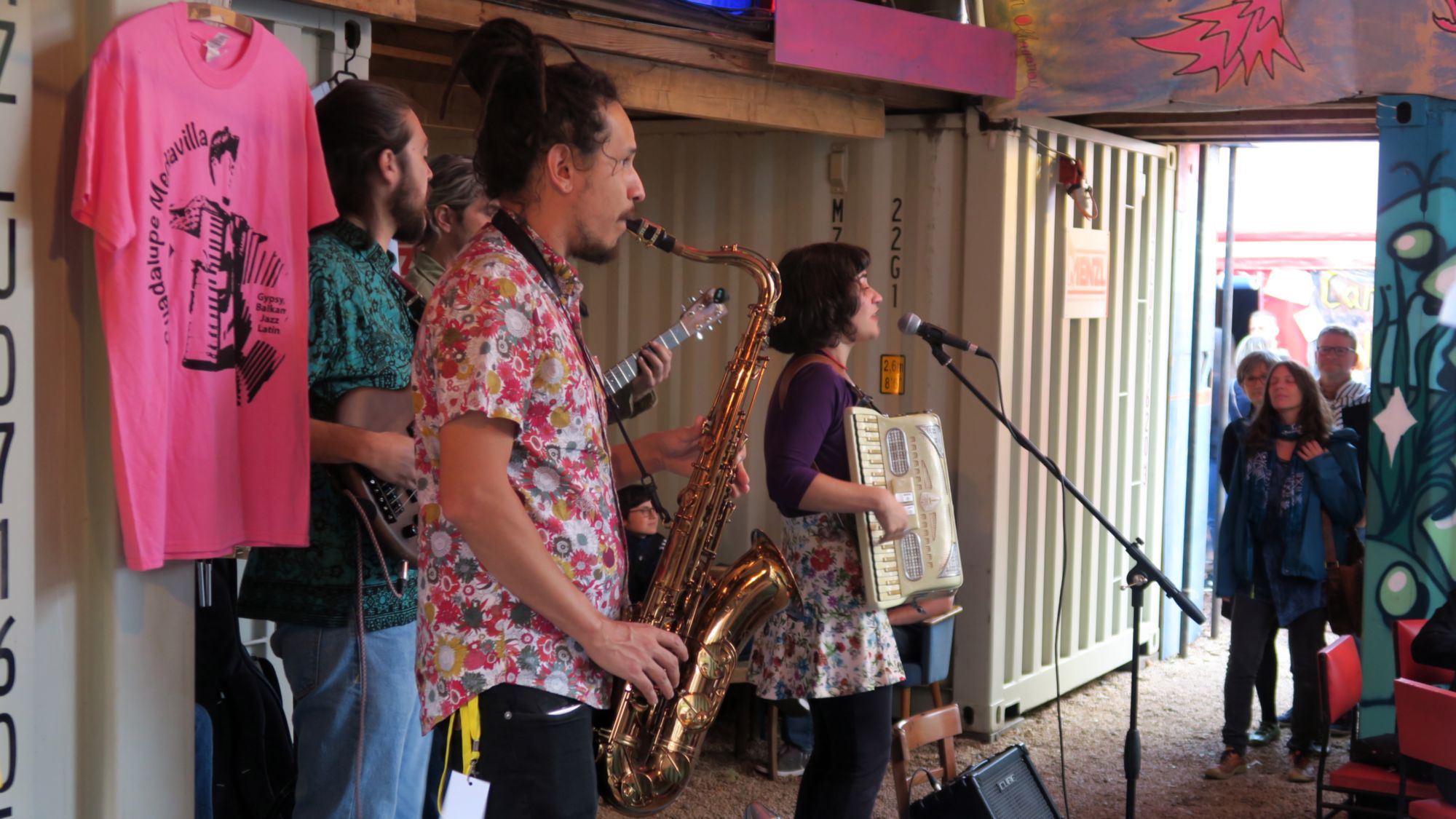 Zwischen den Container spielt die Band „Guadalupe Mediavilla“ eine traurige Mischung aus Gypsy, Jazz, Klezmer, und Tango. So lässt sich der Abend ganz gut ausklingen.