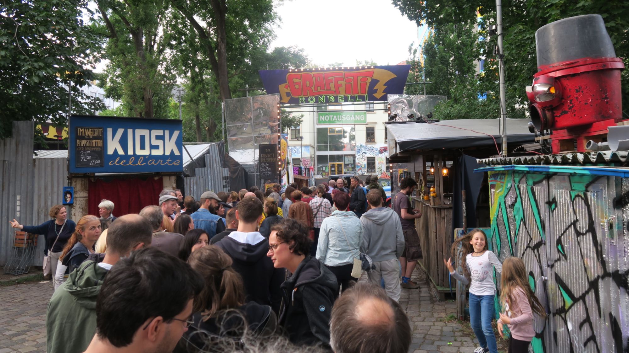 Herrlich. Im Graffiti-Rondell startet es sich am Besten, auch wenn sich die Ansteh-Schlange schon bis vor zur Futterzone erstreckt. In der Schlange tratscht es sich eben am Besten. Inzwischen steht die junge Artistin Sophia Drgala wieder auf dem Boden, ihre Einlage an der sogenannten chinesischen Pole-Stange war der Höhepunkt des Kabarets, das übrigens nur noch heute Abend bei den Buden zu sehen ist.