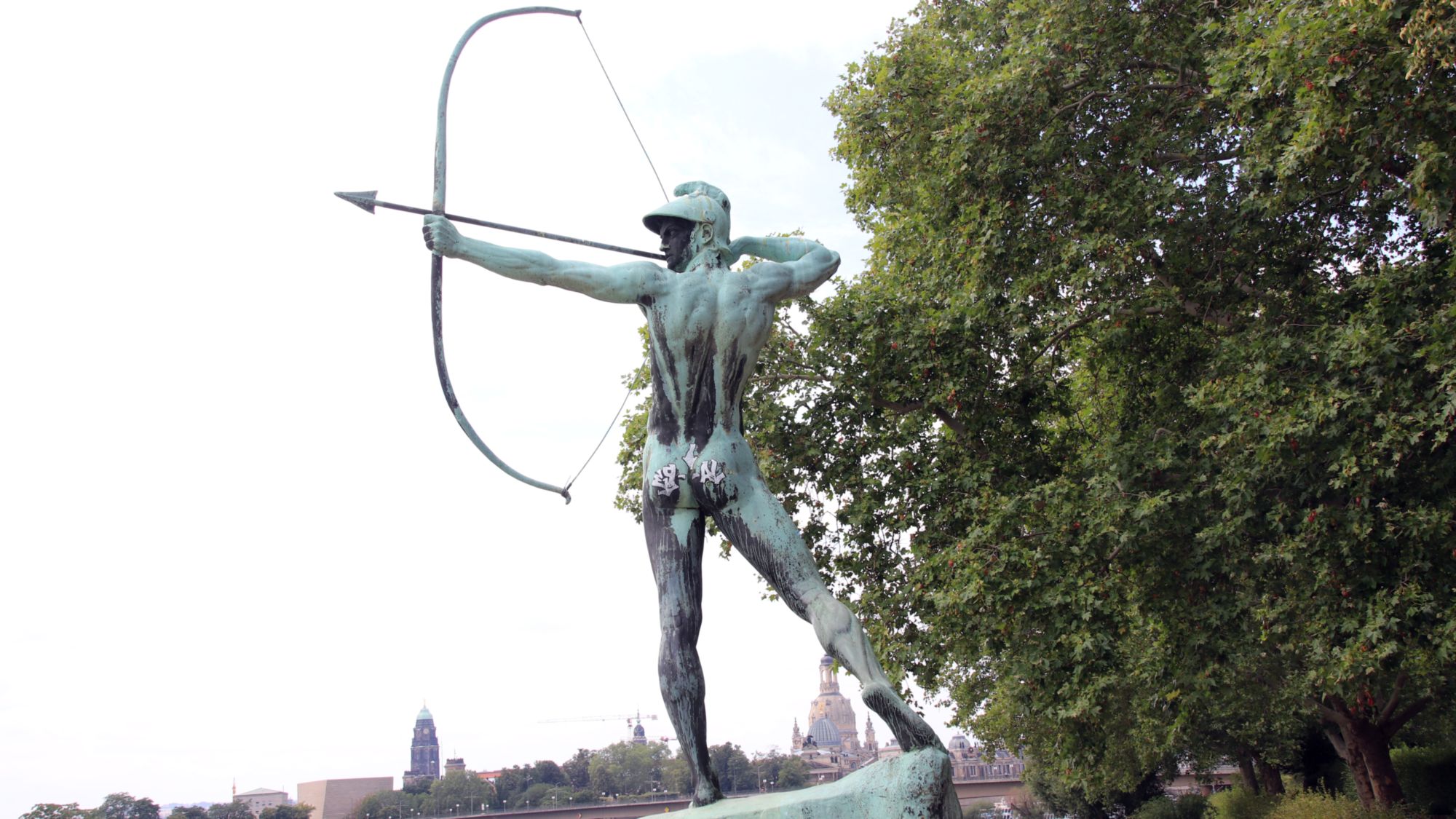 Die überlebensgroße Bronzefigur „Bogenschütze“ von Ernst Moritz Geyger ist von Unbekannten beschmiert worden. Die Plastik steht am Rande des Staudengartens auf einem etwa fünf Meter hohen Sandsteinsockel. Geyger hatte die Plastik ursprünglich 1895 gefertigt. Das Original befindet sich im Park Sanssouci in Potstam, am Staudengarten steht der Zweitguss.
