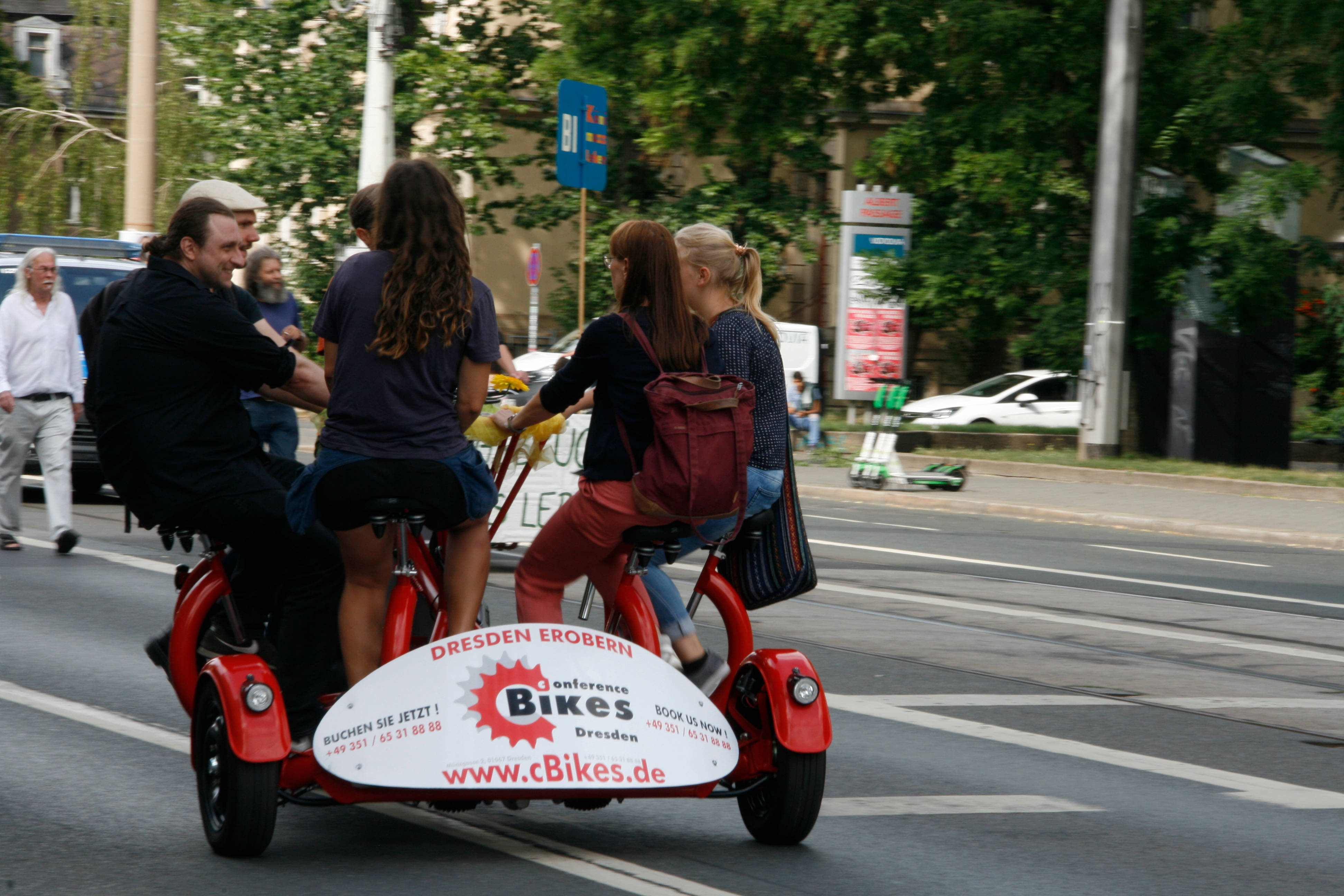 Mit diesem Ausspruch rollten und spazierten an die 200 Menschen gemütlich am Dienstag um 15 Uhr vom Alaunplatz los. Mit einem selbstgebauten Anhänger, der nur durch Menschenkraft ins Rollen kommt, zogen sie durch die Neustädter Straßen und gelangten wohl oder übel über die Königsbrücker Straße an den Albertplatz.