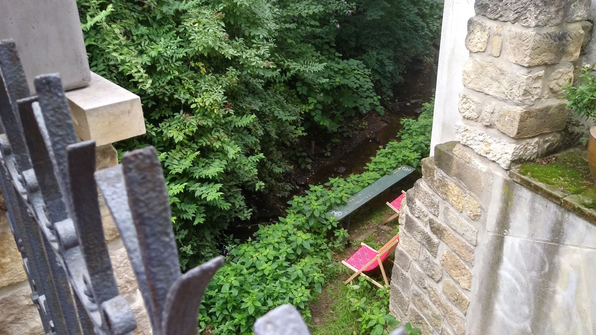 12 Uhr Mittags. Das Angebot hat sich offenbar noch nicht so doll rumgesprochen, wir sitzen hier zu zweit. Ein Bäumchen bietet Schatten, eine Etage tiefer könnte man theoretisch die Prießnitz murmeln hören, aber die Baustelle um die Ecke ist doch ein bisschen lauter.