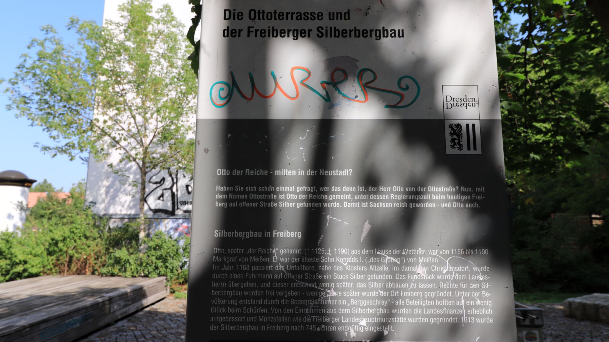 Auf dem Platz steht auch ein weiteres Schild mit Hintergrundinfos zum Namensgeber der Ottostraße. Das ist Otto der Reiche, im 12. Jahrhundert Markgraf von Meißen gewesen. Dank umfangreicher Silberfunde bei Freiberg wurde er später „Der Reiche“ genannt. Das Schild ist zwar auch beschmiert, aber der Info-Text lässt sich noch gut lesen.