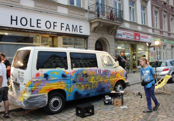„Wir sind keine Galerie!“ Die sieben zu diesem Montagsplenum anwesenden Mitglieder des Hole of Fame (HoF) auf der Königsbrücker Straße sind sich einig. Google hat unrecht. Doch wie für all die Initiativen, Aktionen und Präsentationen, die sich jeden Monat hinter und vor dem Schaufenster des ehemaligen Spiel-Ladens ereignen, einen Oberbegriff finden? „Projektraum“ trifft es am besten. Das Potential des HoF ist seine Wandelbarkeit. Bühne und Wohnzimmer, Kino, Konzertsaal, Atelier, Disko, Podium und Labor: Die Ideen zu seiner Nutzung definieren und gestalten den Raum immer wieder neu.
