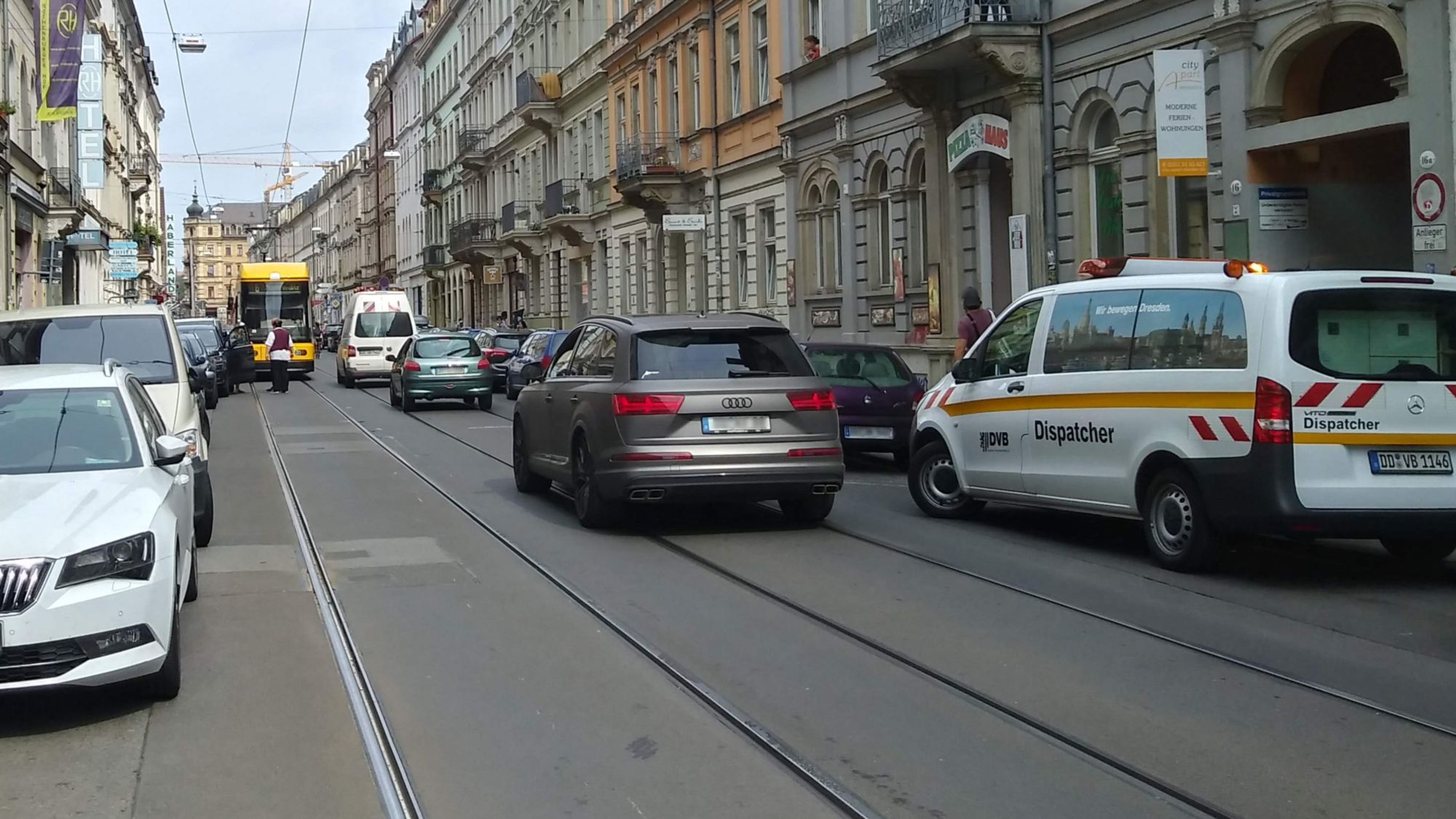 Mittagsstau auf der Rothenburger Straße. Ein fettes Sports Utility Vehicle ragt in die Straße, die Bahn kommt nicht vorbei. Die Dresdner Verkehrsbetriebe (DVB) twittern: „Falschparker … Rothenb.Str.: Umleitung Li.6 in Ri. Niedersedlitz. … Umleitung Li.13 in Ri. Prohlis“. Weil die Bautzner Straße gerade gebaut wird, fallen die Umleitungen richtig weitläufig aus. An der Haltestelle vor dem Bautzner Tor werden die Fahrgäste per Lautsprecherdurchsage informiert.