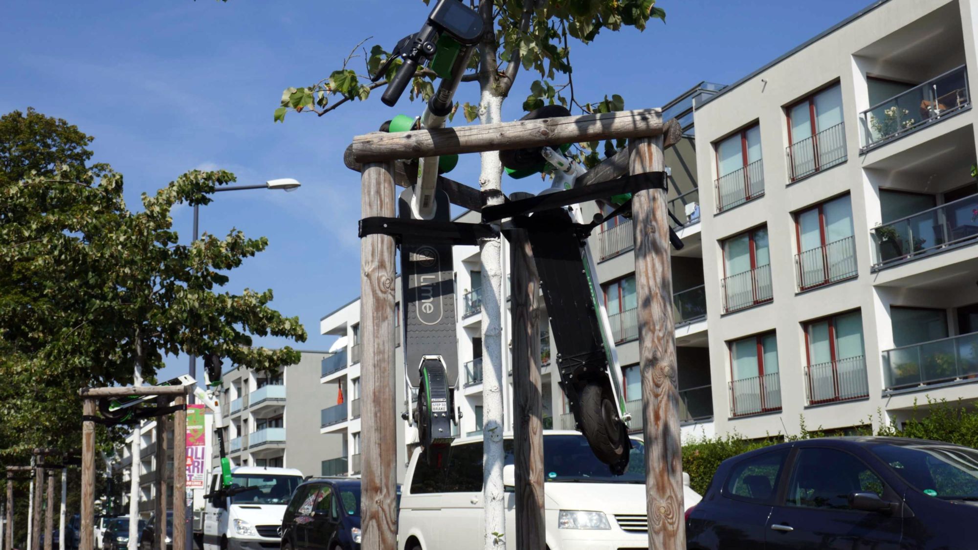 Unbekannte haben an der Rothenburger Straße in der Nähe der sozialen Ecke drei E-Roller aufgehängt. Gesehen von Erich am Morgen.